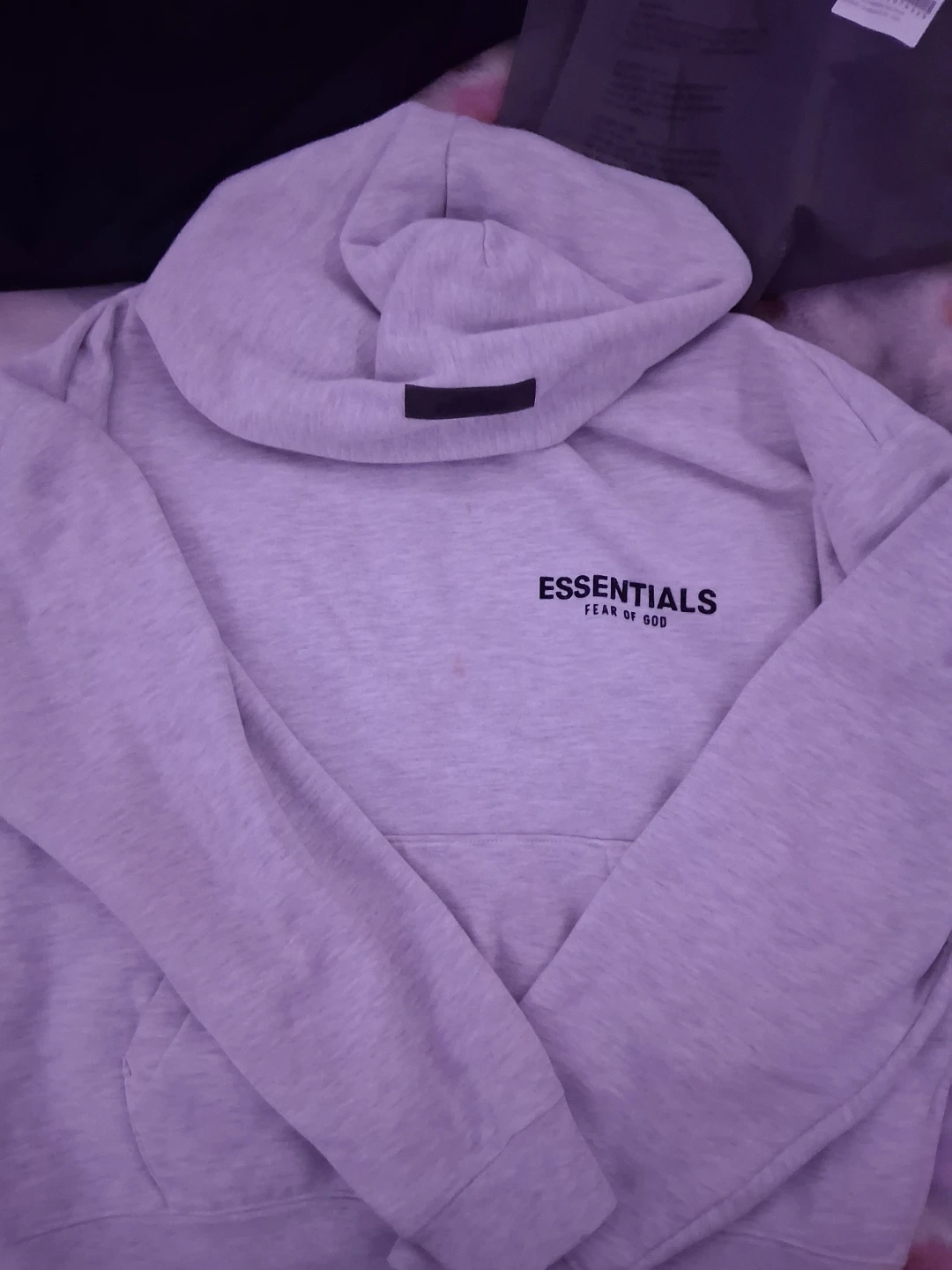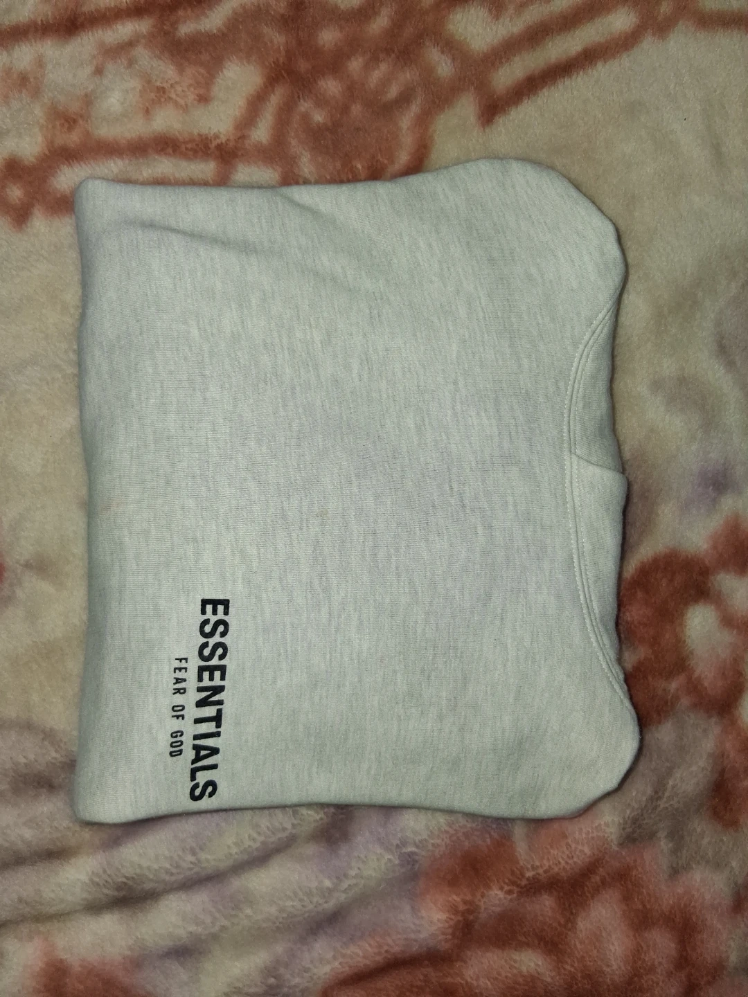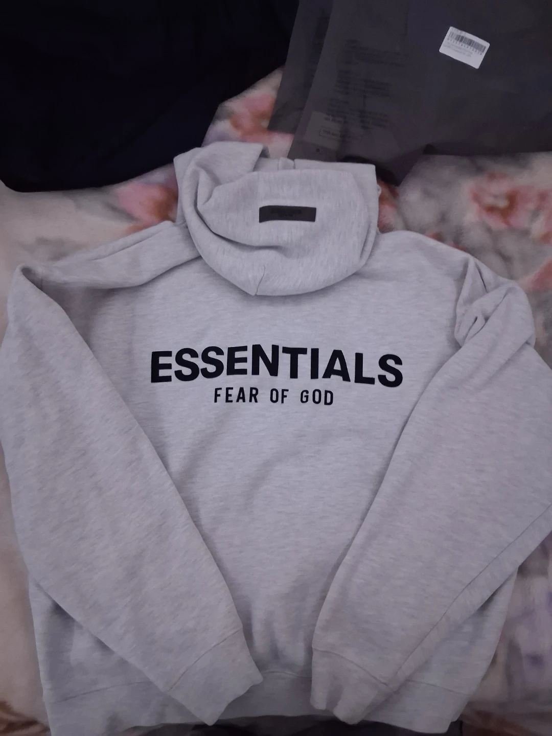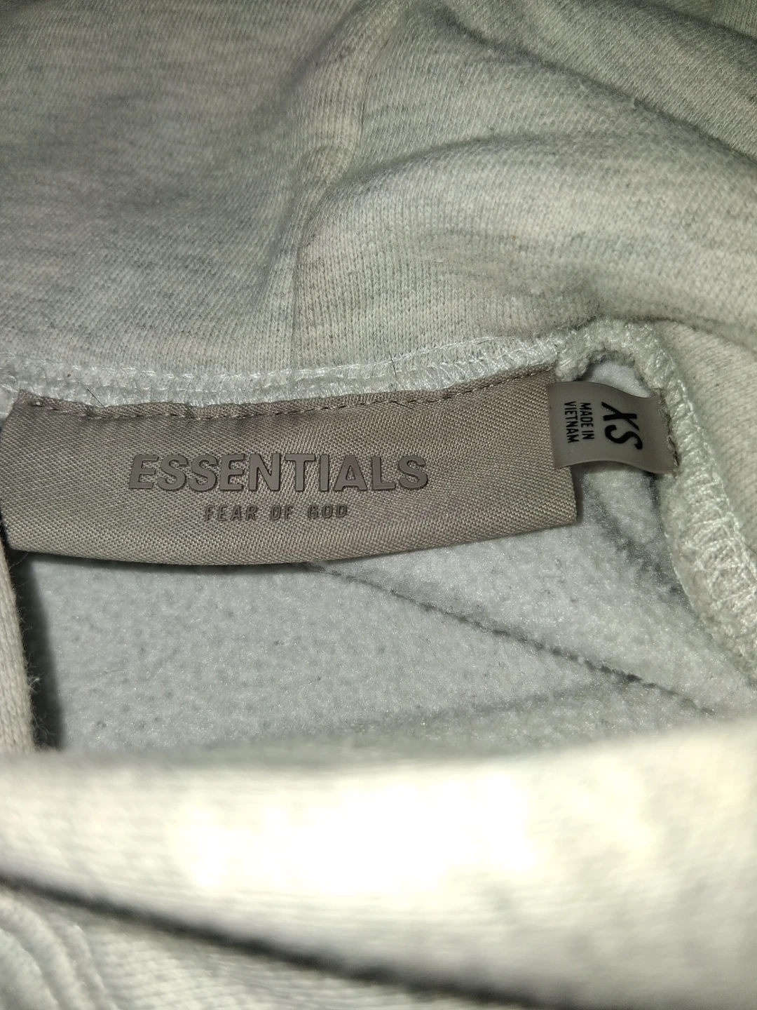 Selling an Essentials Fear of God hoodie in size XS. It's a light grey colour and made in Vietnam. The hoodie has the ESSENTIALS FEAR OF GOD logo on the front. Perfect for layering or wearing on its own!