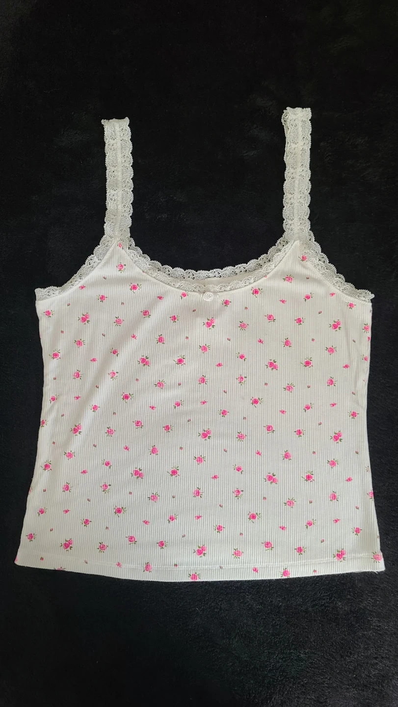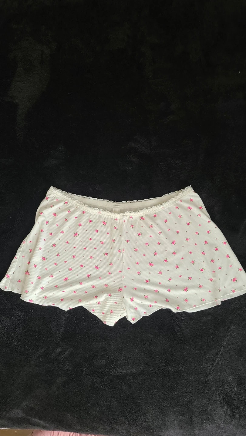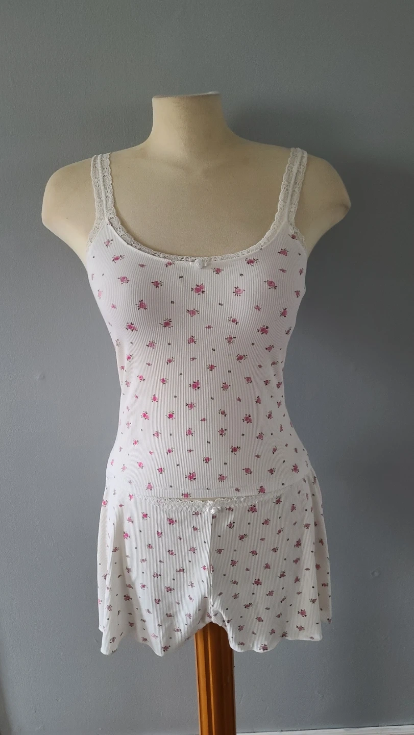 The cami is a medium (fits 8-10 or 29-31" waist) and the shorts are a size large (fits 12-14 or 42-44" hips).
