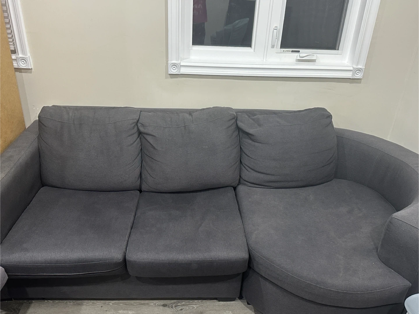Selling a comfy grey sectional sofa with a chaise lounge! It's in good condition and ready for a new home. Perfect for relaxing and watching movies or having friends over