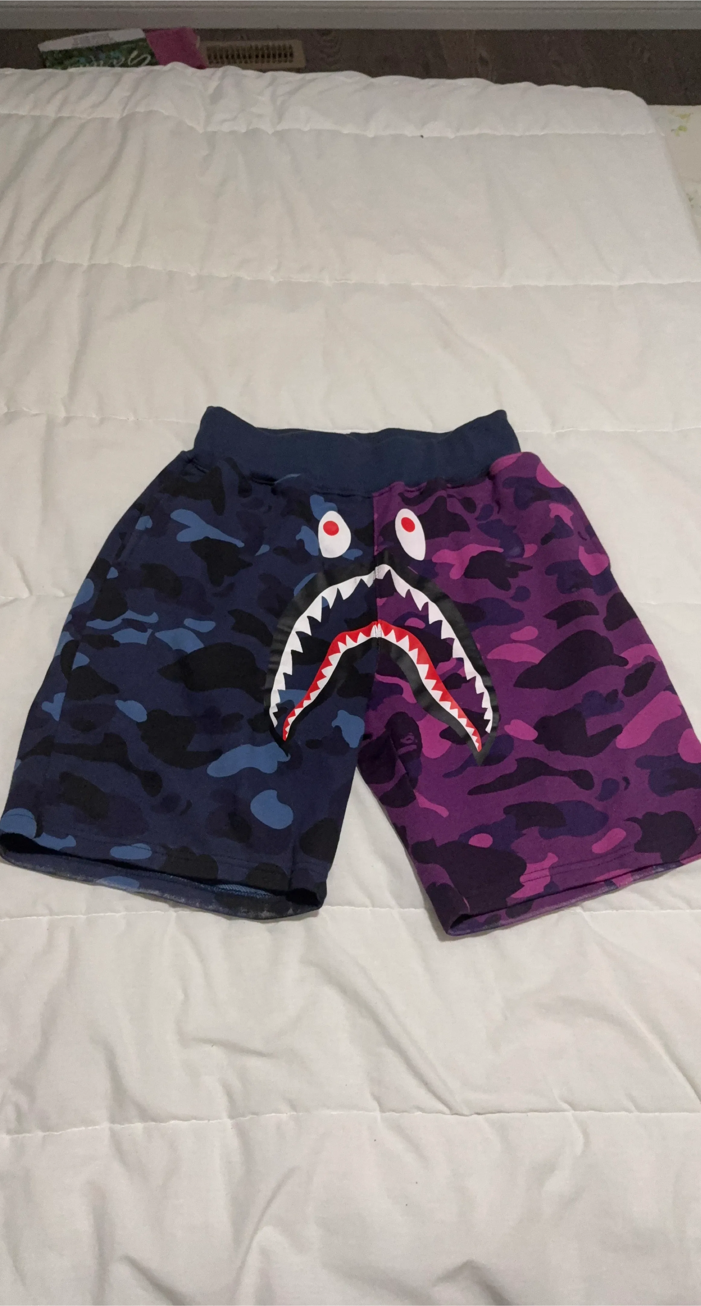 Selling a pair of A Bathing Ape (BAPE) shark shorts in size L. These shorts feature a unique two-tone camouflage design with the iconic shark graphic. They're in great condition and ready for a new owner!