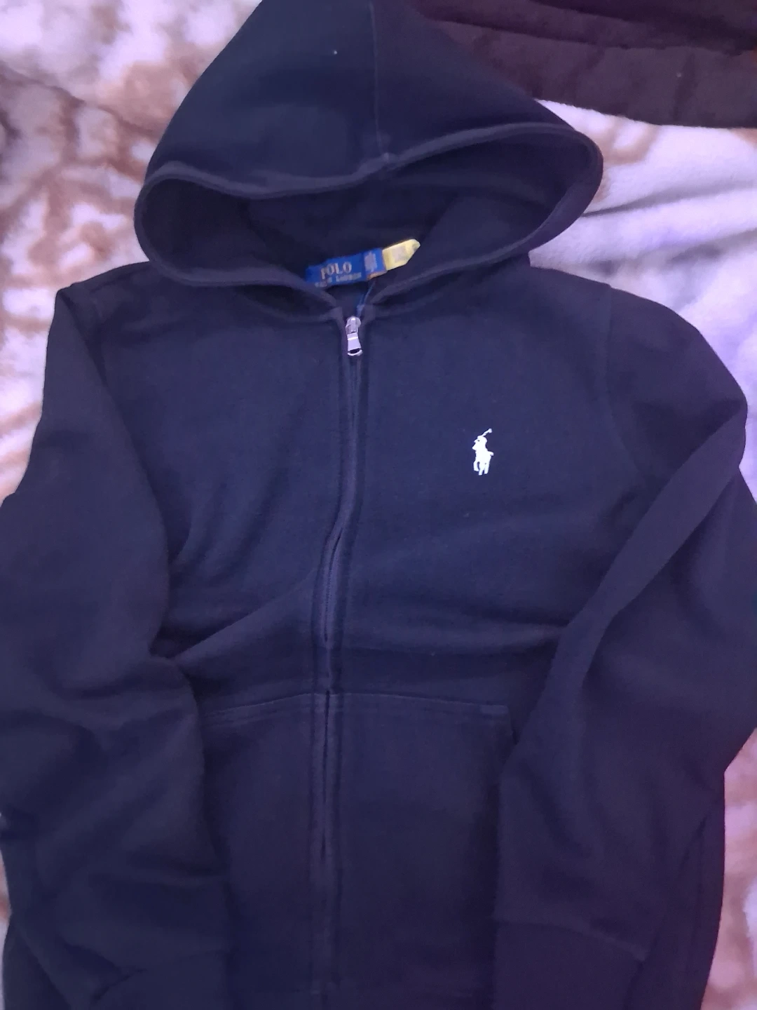 Selling a Polo Ralph Lauren hoodie in black. It's made of 100% cotton and has a full zipper. The hoodie features the classic Polo logo. Perfect for staying cozy!