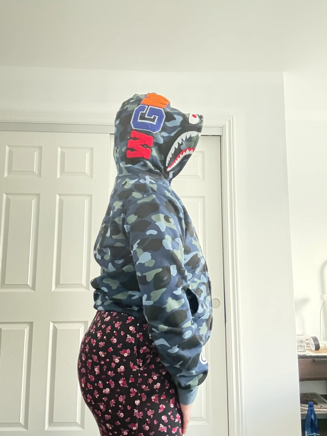 Selling a Bathing Ape (BAPE) shark camo hoodie in size medium. The hoodie features a cool camo pattern with the iconic shark design on the hood. It's in great condition and ready for a new owner! last 2 slides are the sweater on someone. it’s actually very warm never tried it on ever 😂 due to it being my brothers and it’s too small for him and i don’t like these things tbh or don’t really care for 😭