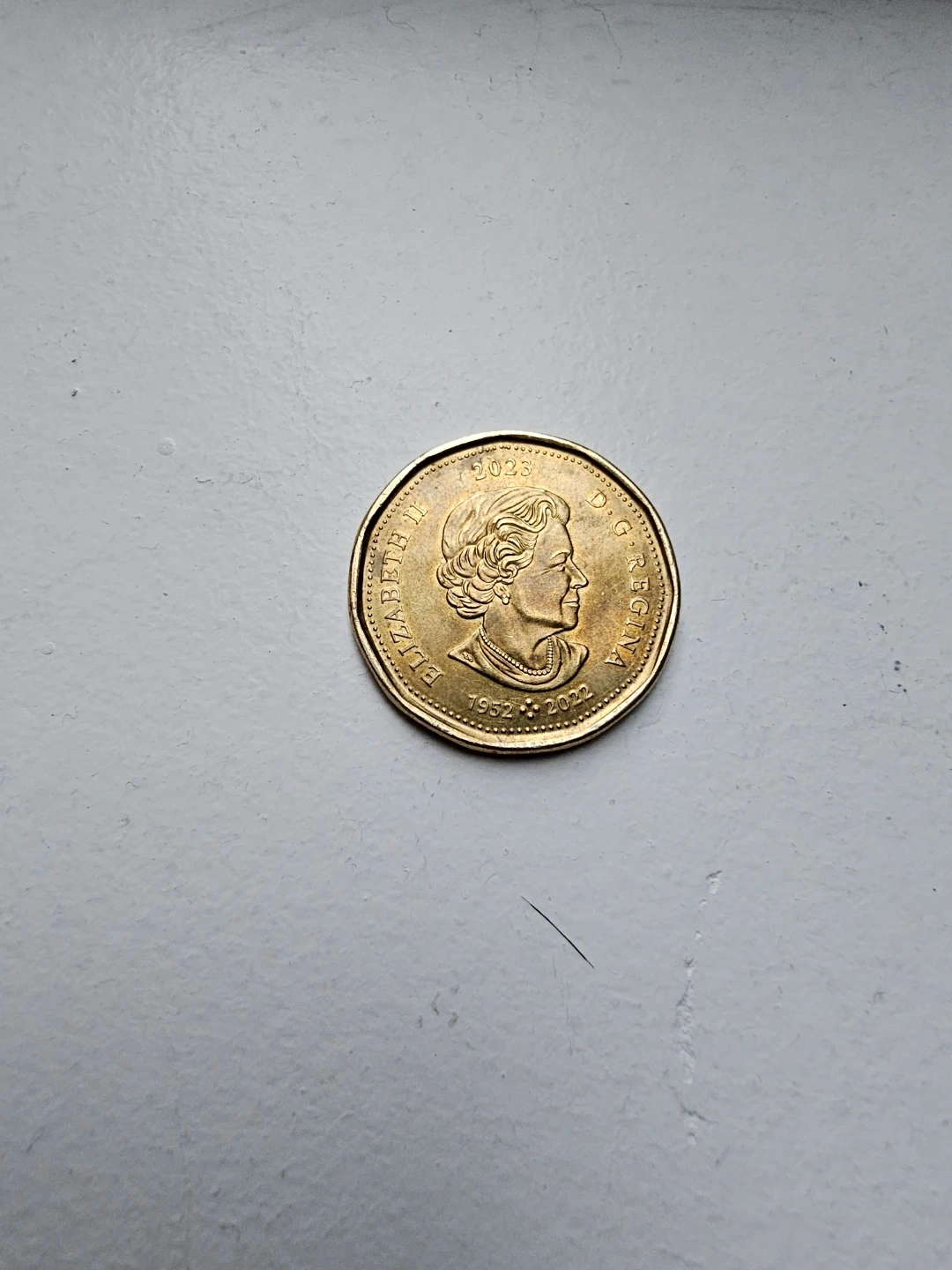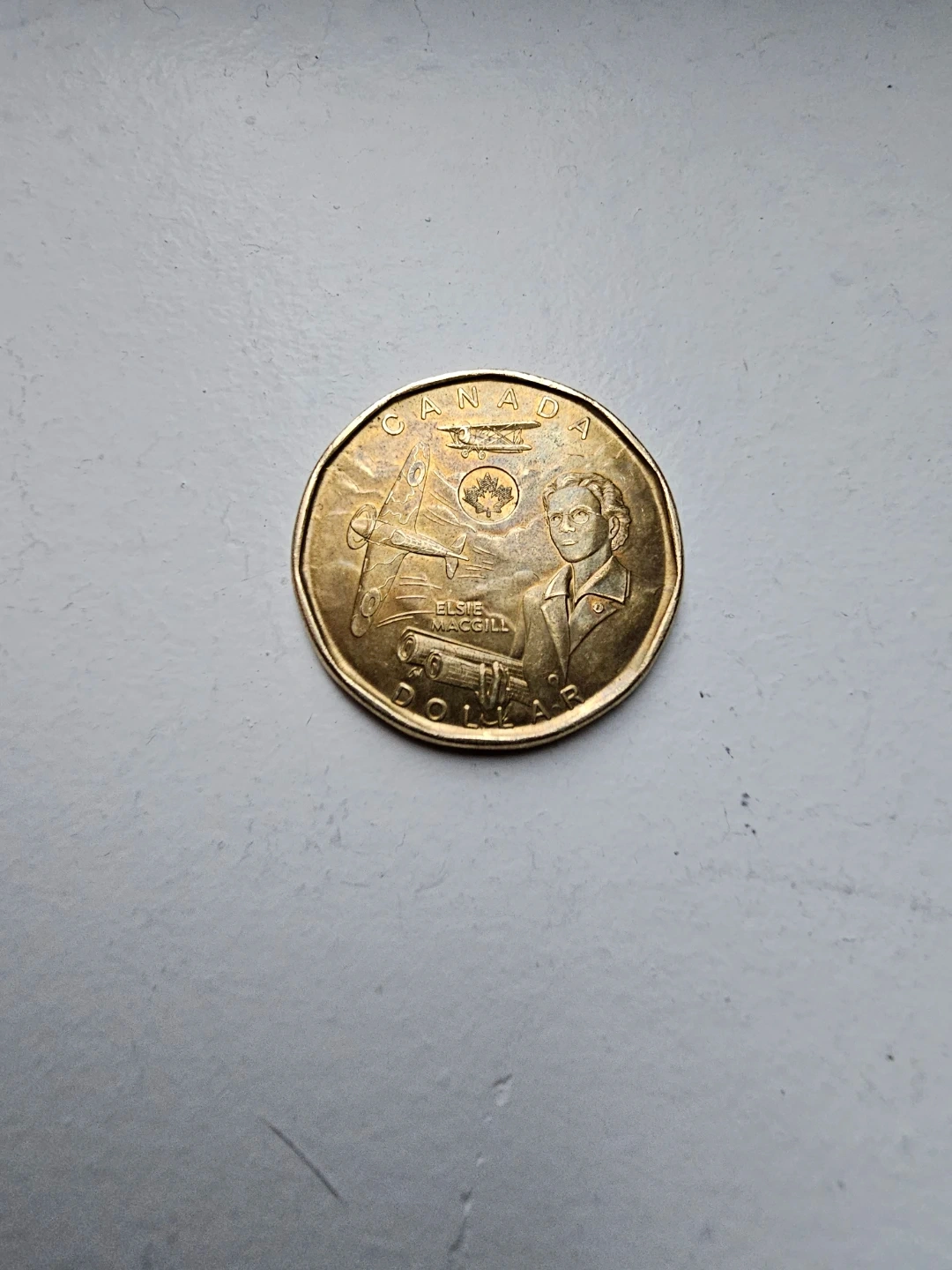 Selling a Canadian one dollar coin. It features Elsie MacGill and an airplane on one side, and Queen Elizabeth II on the other