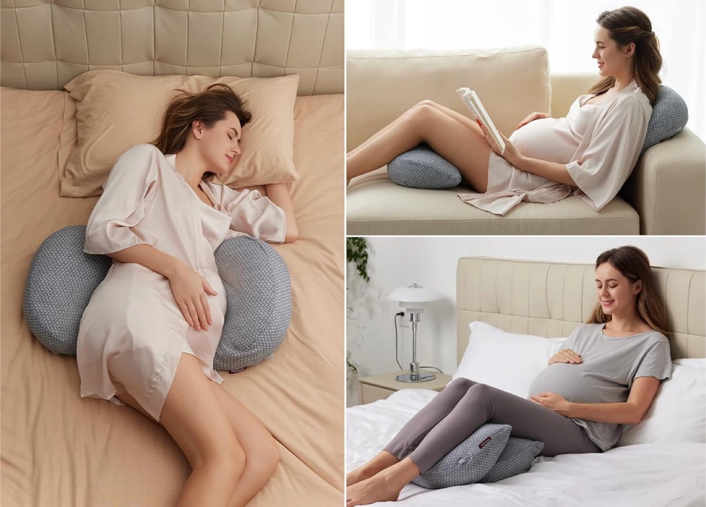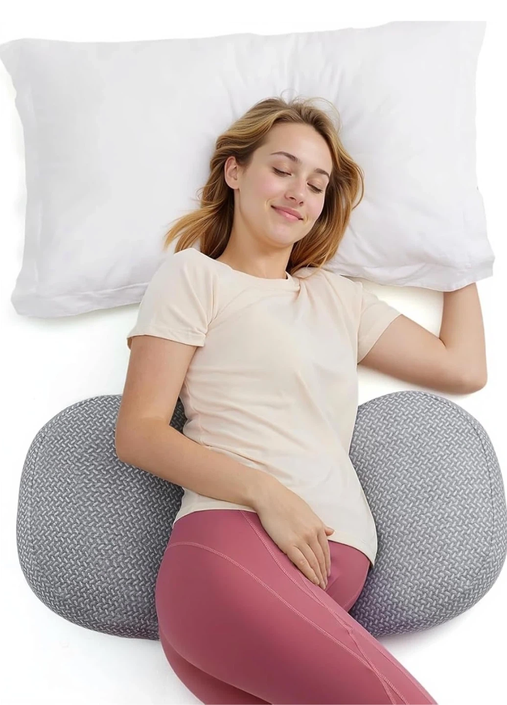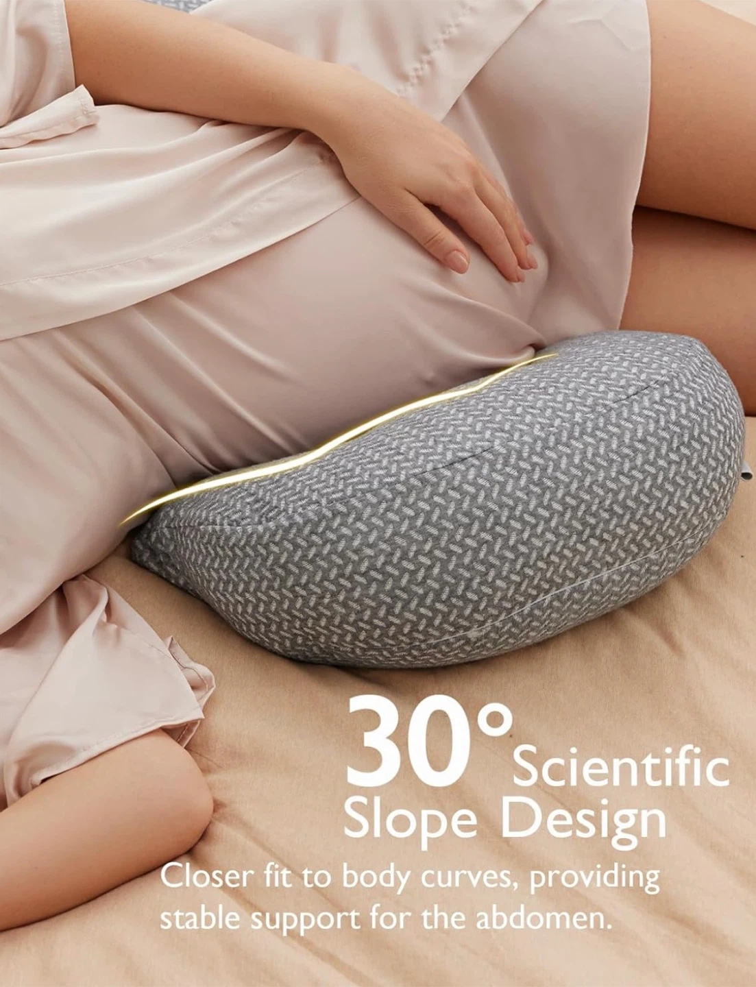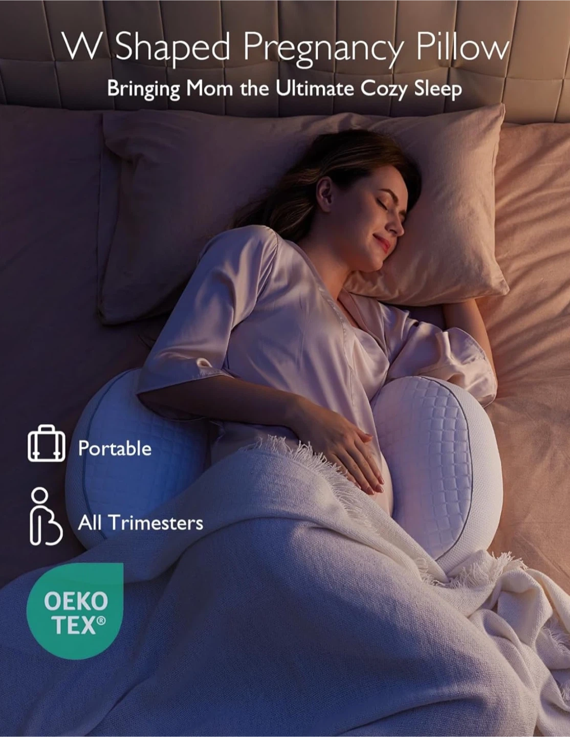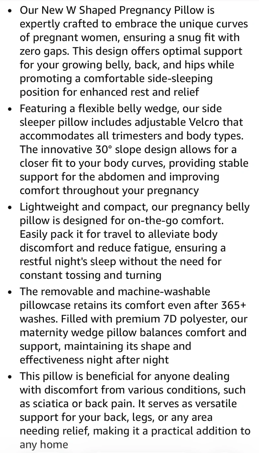 W-shaped maternity pillow providing support for belly, back, and hips. Lightweight, adjustable, and ideal for side sleeping. Also great for back or sciatica pain.