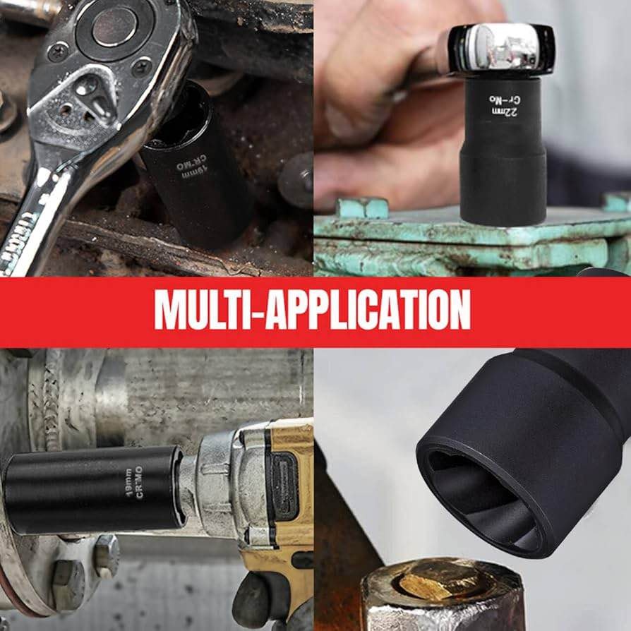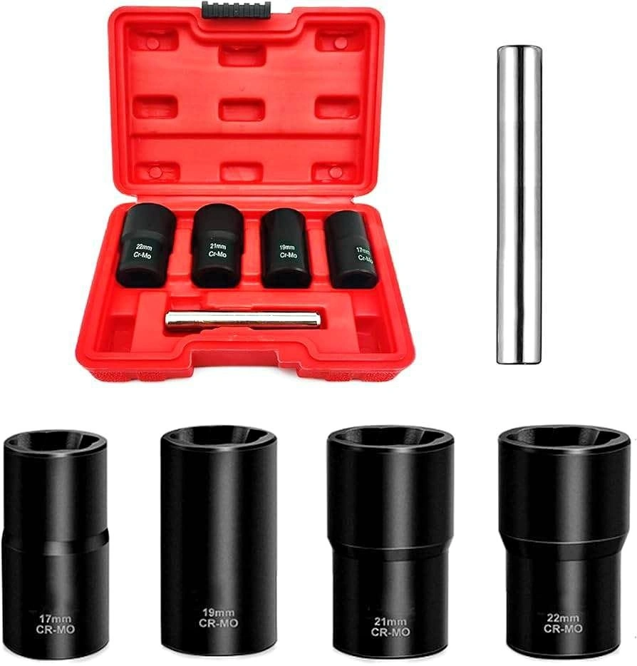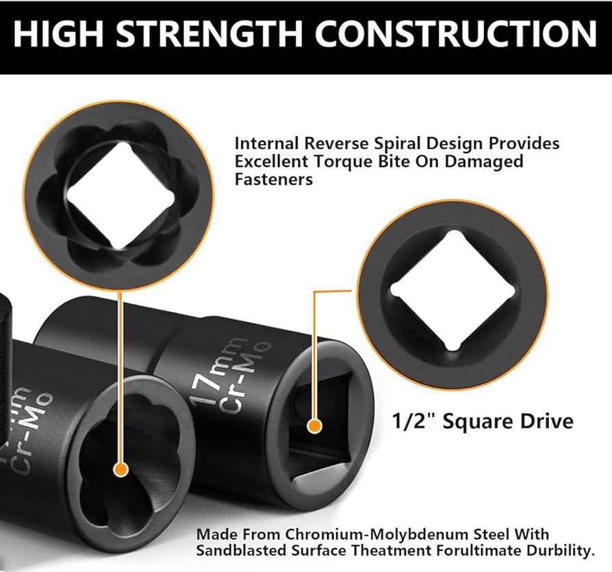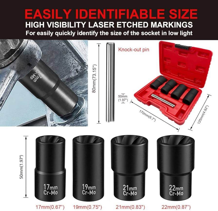 5 pcs Wheel Nut Removal Tool Set, 1/2 Inch Impact Torque Socket Set and Bolt Extractor Set, Wheel Lock Removal Kit, Torque Socket Set for Damaged, Frozen, Rusted Round Bolts, Metric 17-22mm