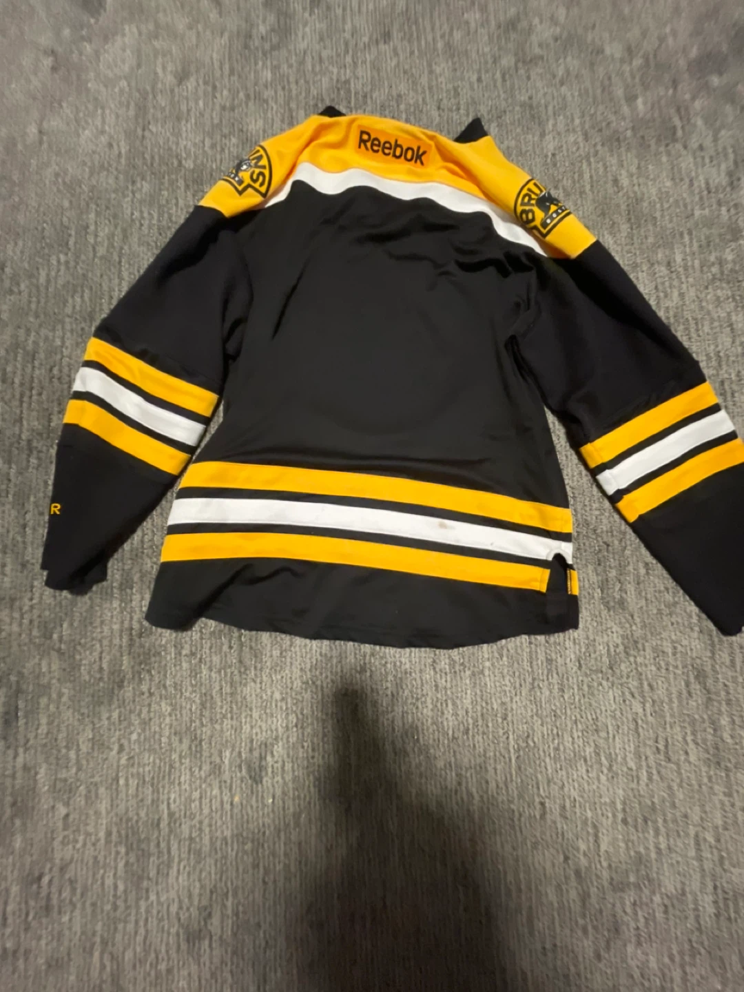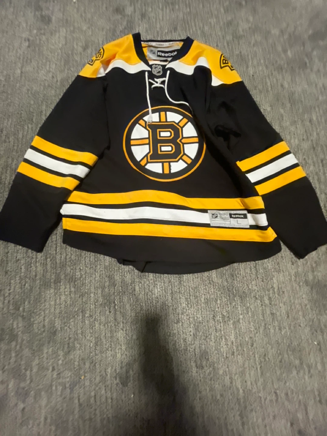 Selling a Reebok Boston Bruins hockey jersey in size L! It features the classic black and gold colours with the Bruins logo on the front. Perfect for any hockey fan!