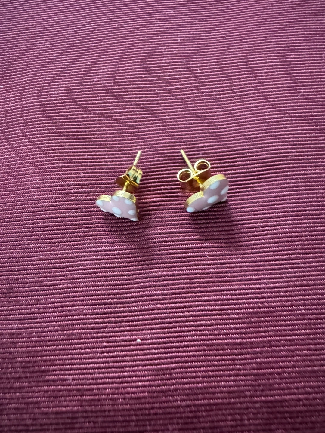 Cute heart stud earrings, post back, with pink polka dots! They are 14K Gold plated, New, and uniquely handmade!
