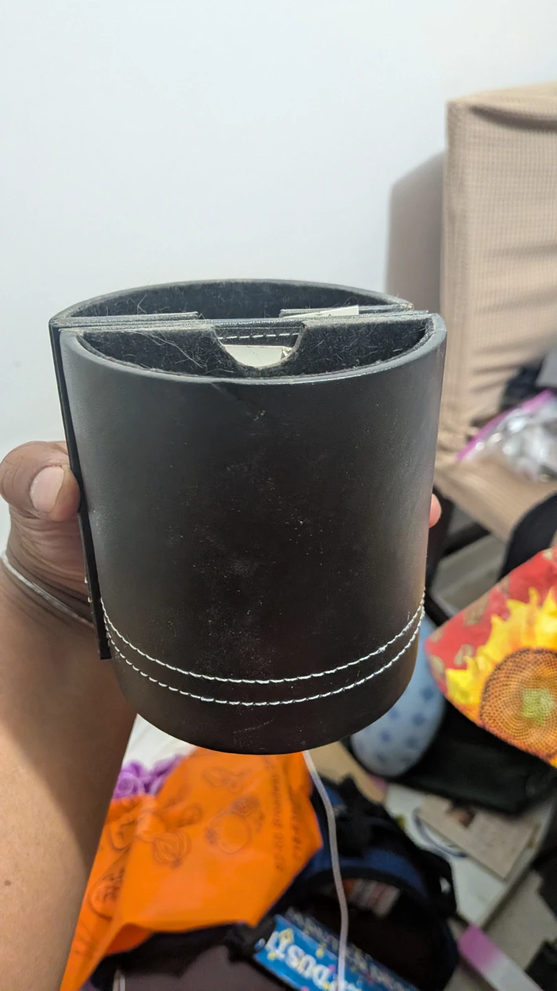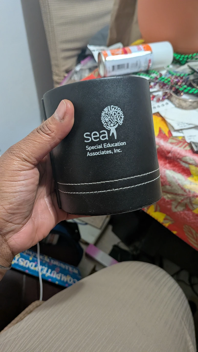 I'm selling a black desk organizer. It has a logo that says SEA Special Education Associates, Inc. It is in used condition and has a few scuffs and scratches.