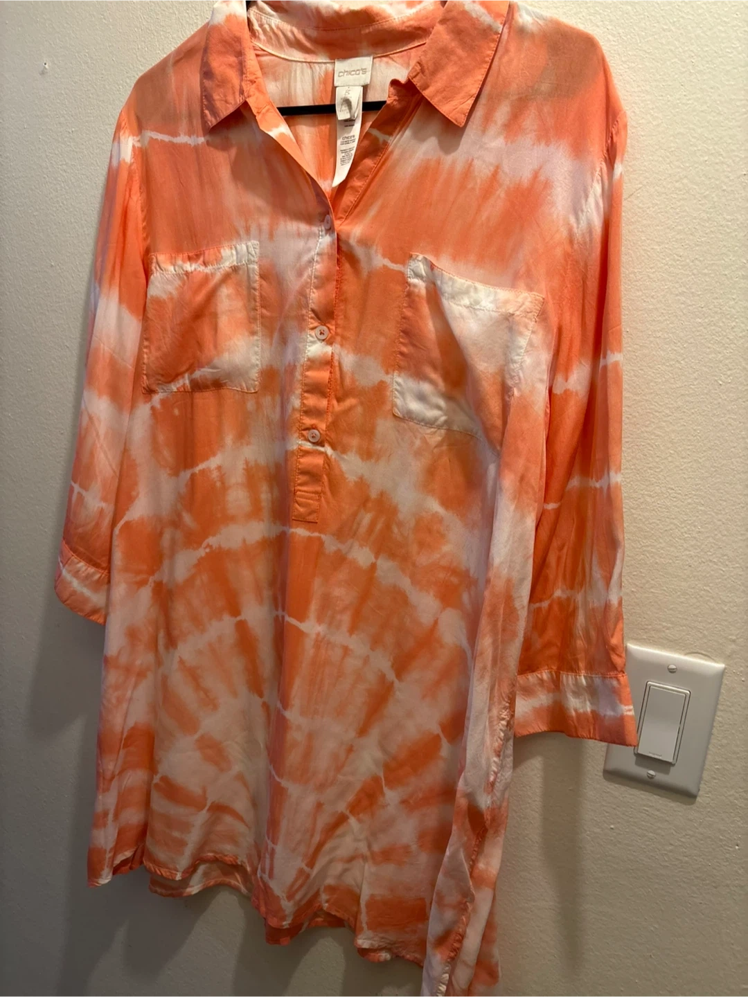 Cute Chico's tunic with an orange and white tie-dye pattern! It's a size 1 and features a collared neckline with button closures. Perfect for a casual and stylish look.