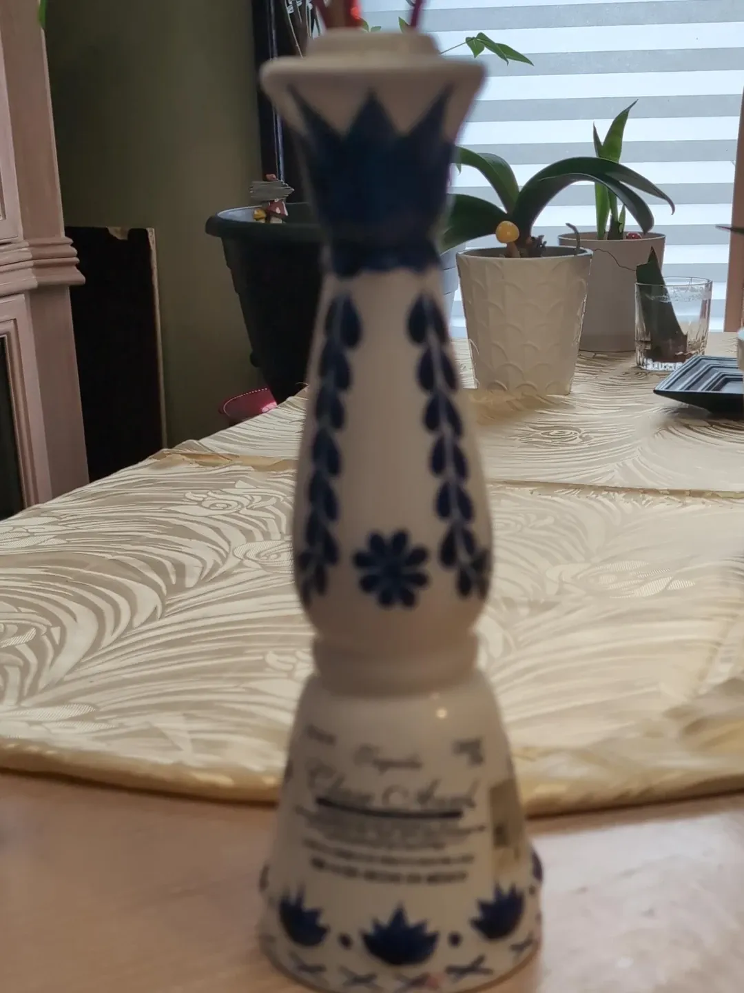 Selling a Clase Azul Reposado tequila bottle. It's a beautiful, hand-painted ceramic bottle with a distinctive design. Perfect for display or repurposing! The bottle is white with blue floral and leaf patterns.