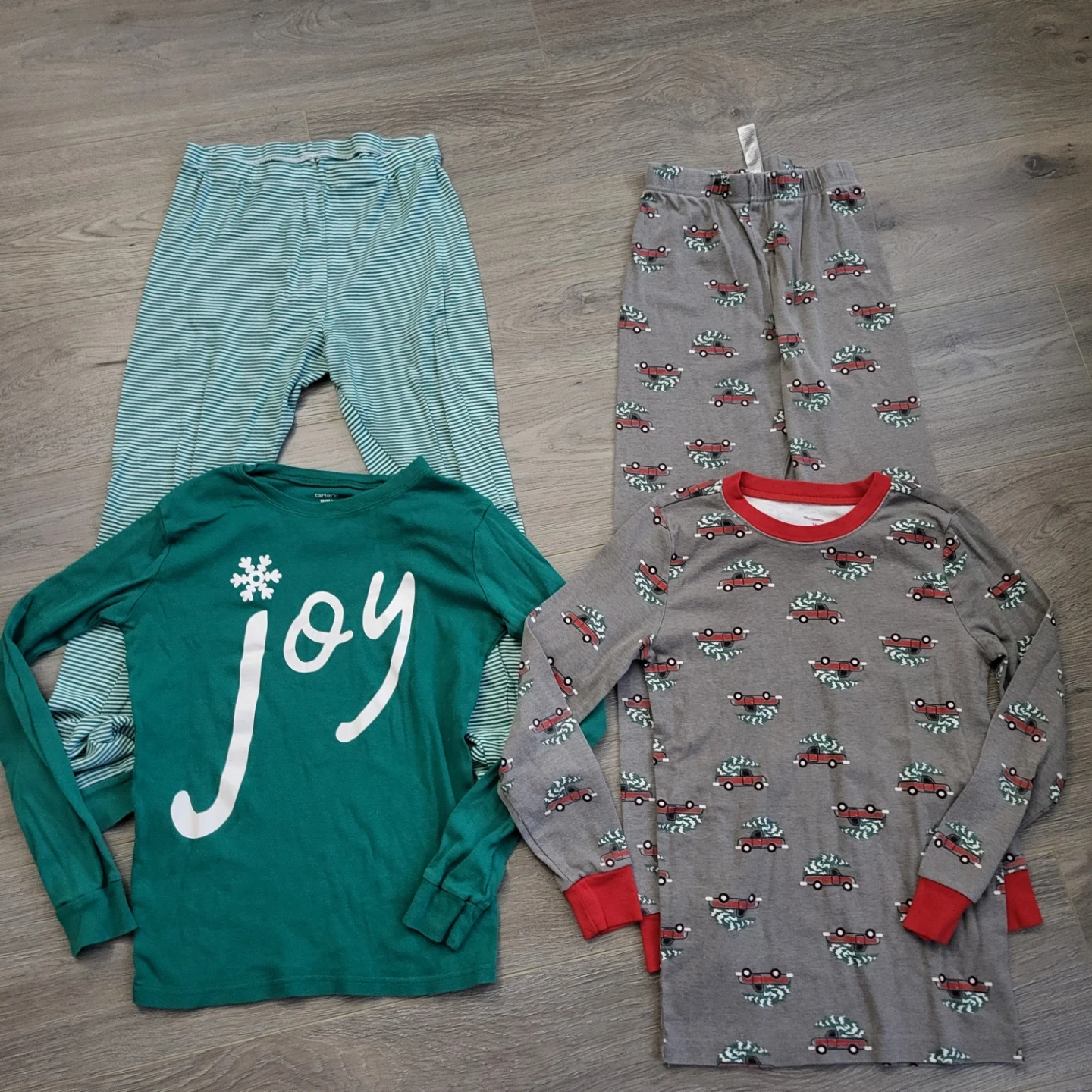 Two cute holiday pajama sets from Petit Lemand Carters. One set features a green long-sleeve shirt with 'Joy' and striped pants. The other set has a grey long-sleeve shirt with a red car and Christmas tree pattern and matching pants. Both are size 14 and in great condition.