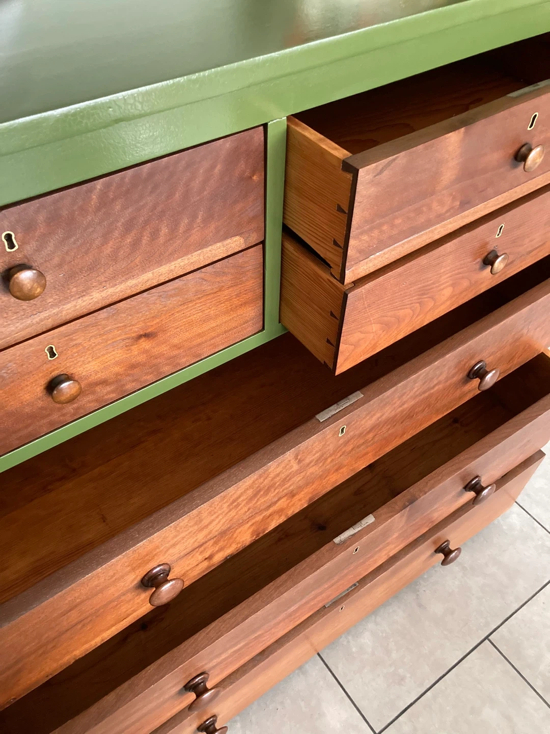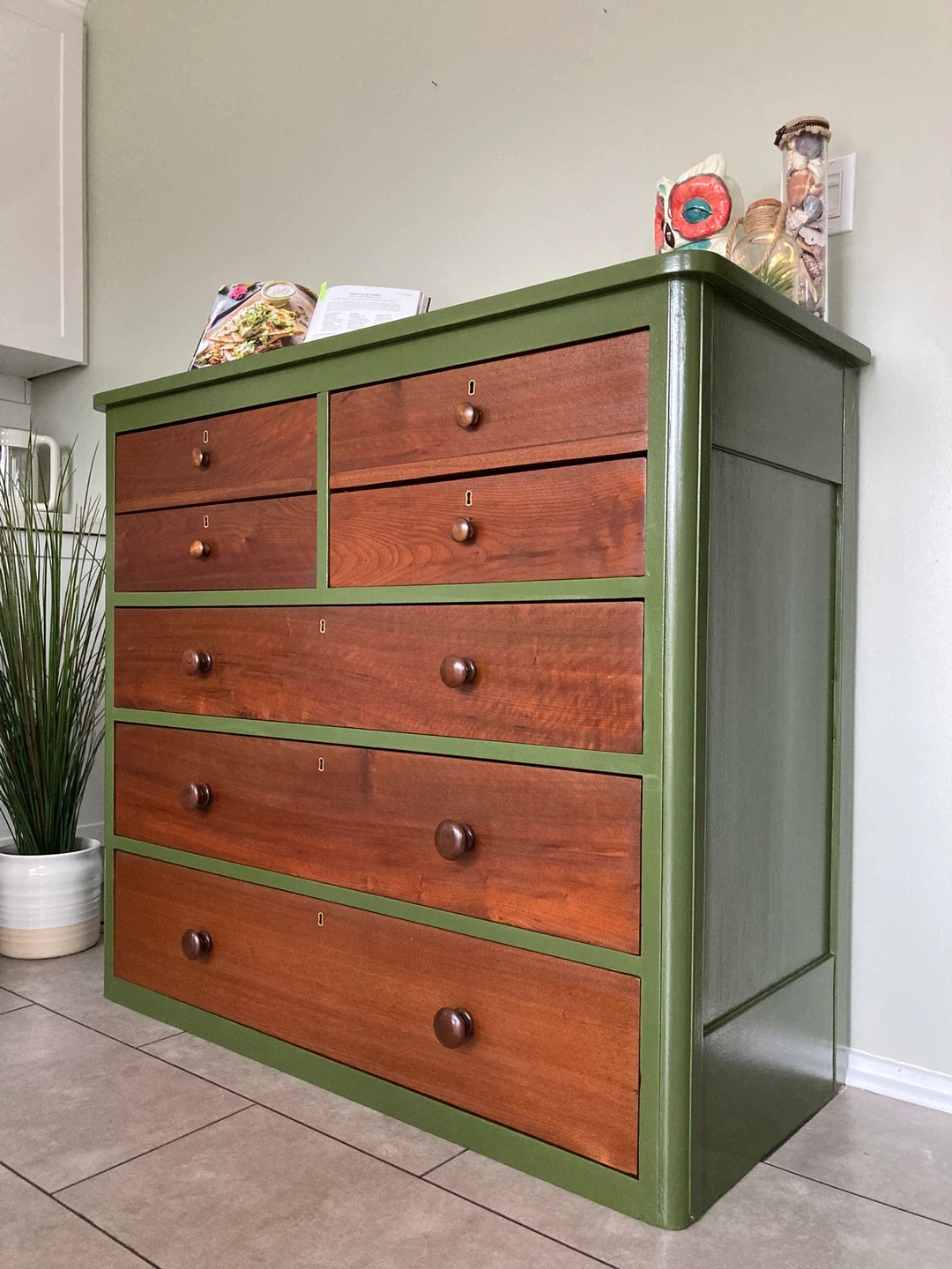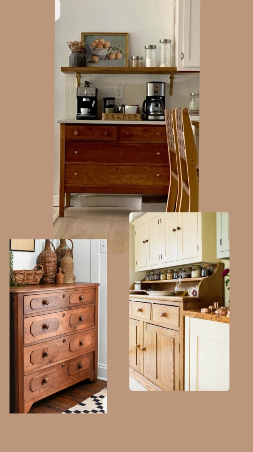 This is the coziest dresser with surprisingly generous storage. I especially love the idea of using vintage dressers in kitchens for added warmth and hidden storage (see last 2 photos for inspiration only). It would also be perfect as: