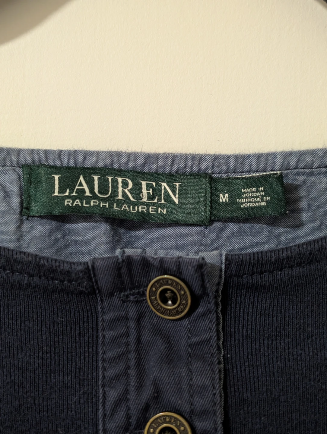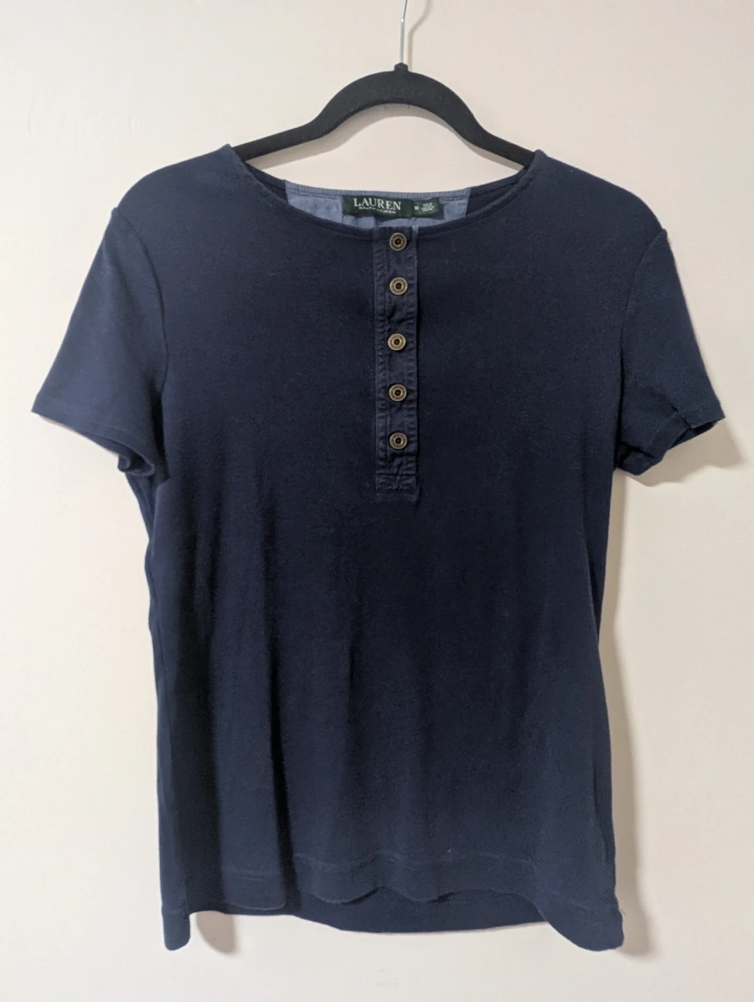 A classic Lauren Ralph Lauren button-up tee in size medium! It's a stylish and comfortable piece made from 100% cotton. The dark blue colour makes it versatile for different outfits and occasions. Machine washable too!
