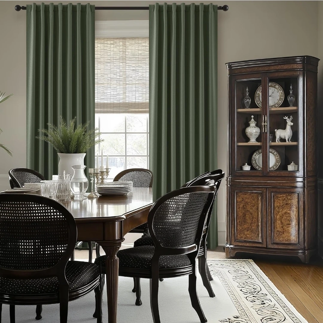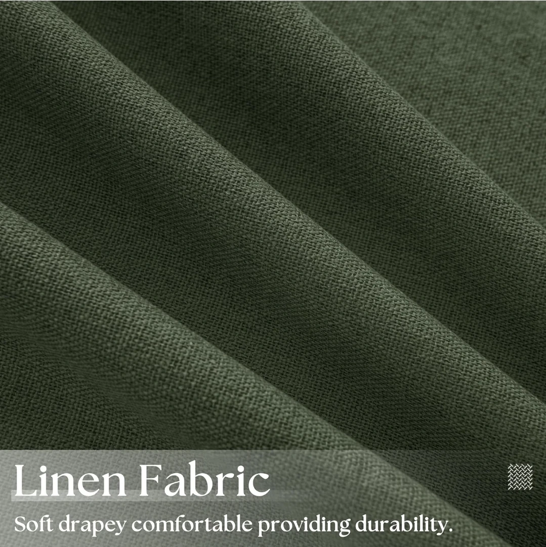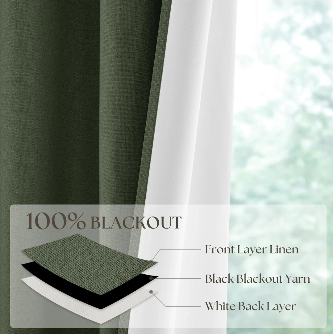 These are Olive Green 100% Blackout Curtains, perfect for bedrooms. They're linen textured and measure 52x84 inches. They're designed to fully block light, offering thermal insulation and energy saving benefits