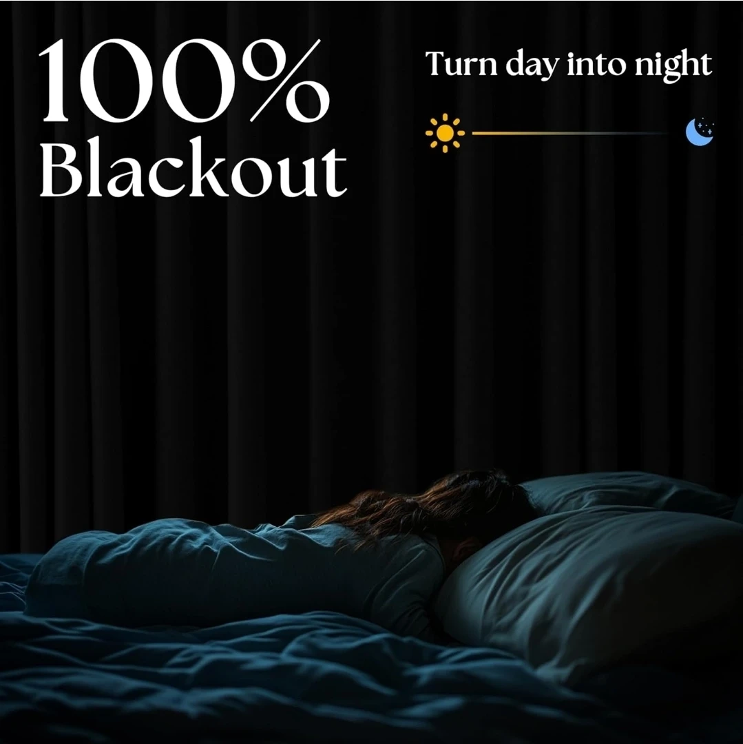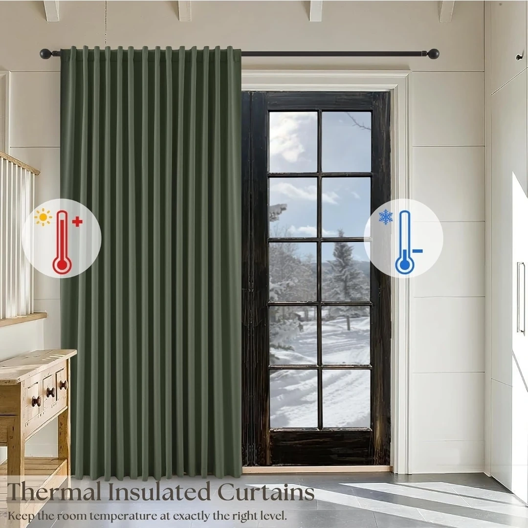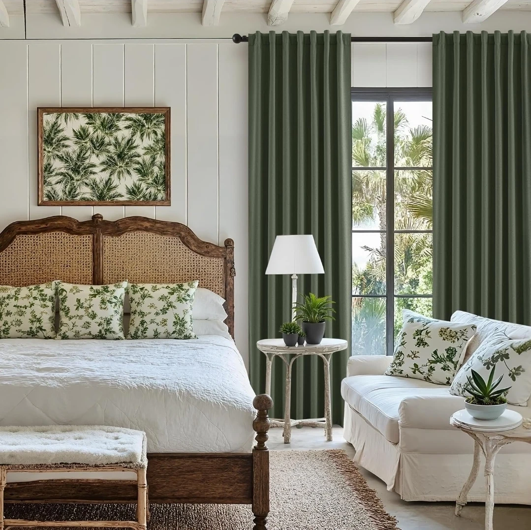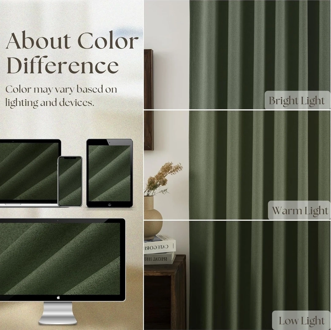 These are Olive Green 100% Blackout Curtains, perfect for bedrooms. They're linen textured and measure 52x84 inches. They're designed to fully block light, offering thermal insulation and energy saving benefits