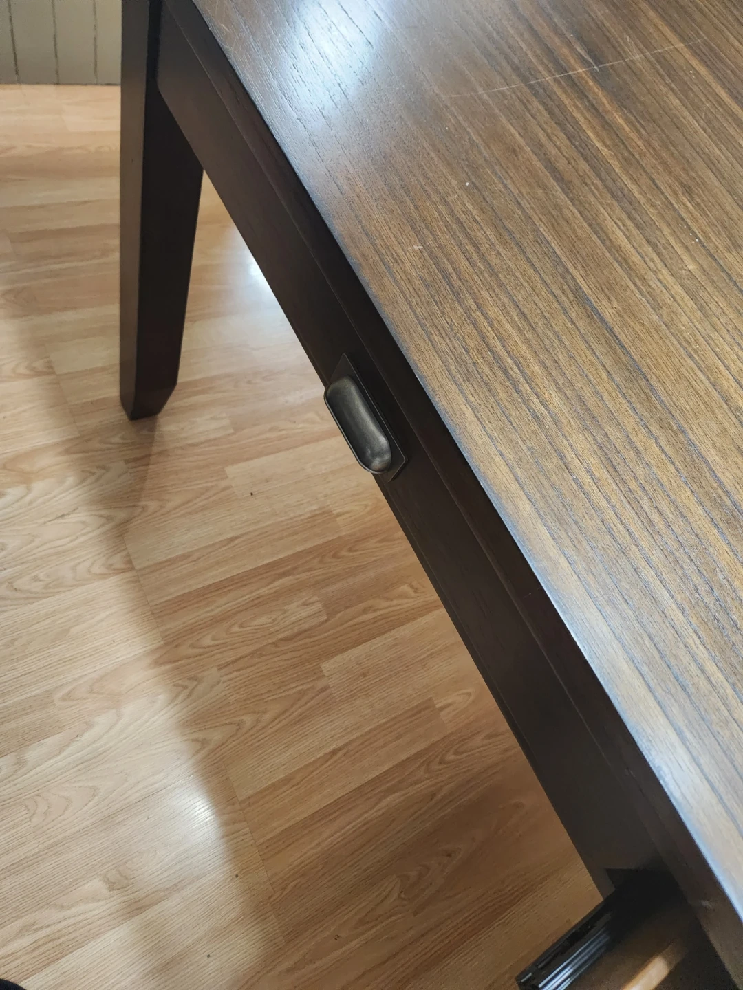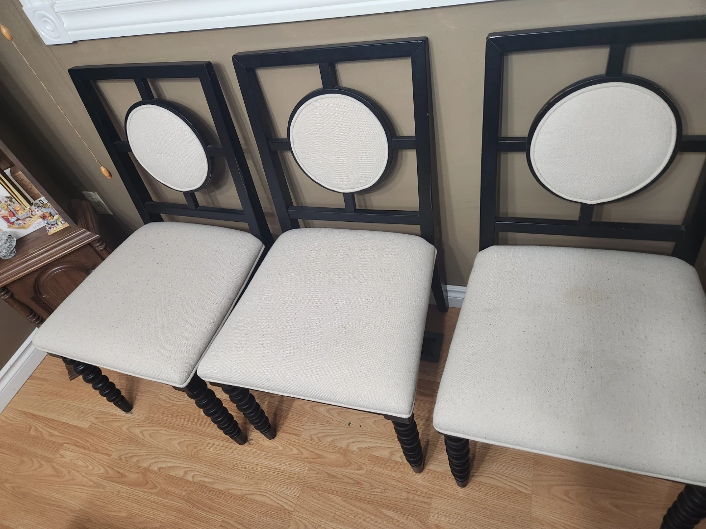 Dining table with three chairs. The table is a dark wood colour, and the chairs have a black wood frame and a cream coloured cushion. Great for a dining room or kitchen! and only one or two scratches in excellent condition and it is quite stable
