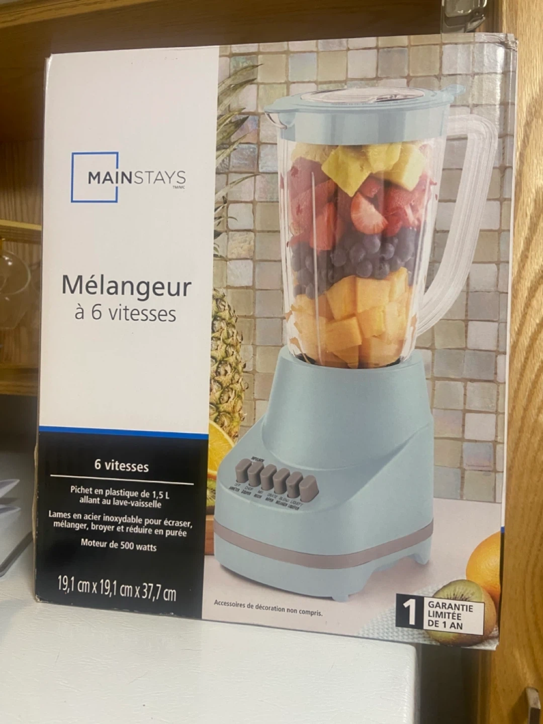 Selling a BNIB! Mainstays 6-speed blender in excellent condition! The box includes a 48 oz (1.5 L) dishwasher-safe plastic pitcher, stainless steel blades, 6 speeds with pulse function, 500 watts of power, cord storage, and skid-resistant feet. The pitcher cap also serves as a 1 oz (30 ml) measuring cup. Dimensions are 19.1 cm x 19.1 cm x 37.7 cm
