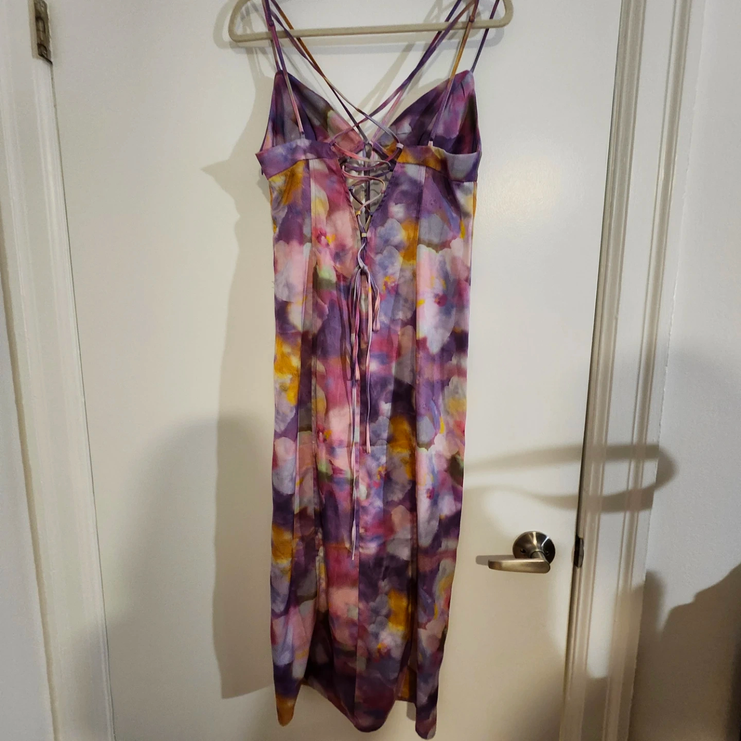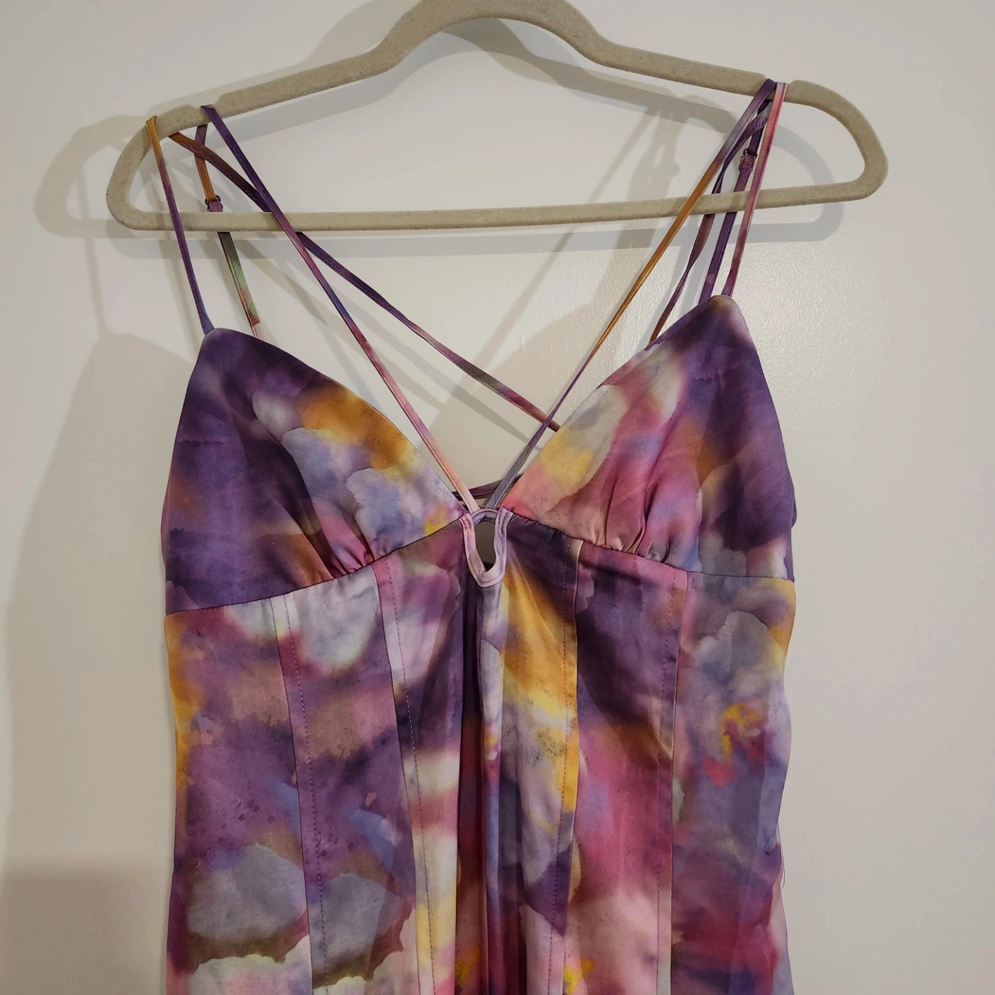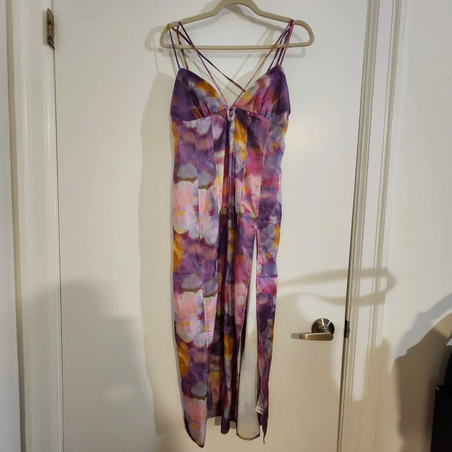 Here's a lovely dress with a unique floral pattern in shades of purple, yellow, and white! It features a stylish strappy design and a flattering silhouette. The dress is perfect for adding a pop of colour to your wardrobe and is sure to turn heads.
