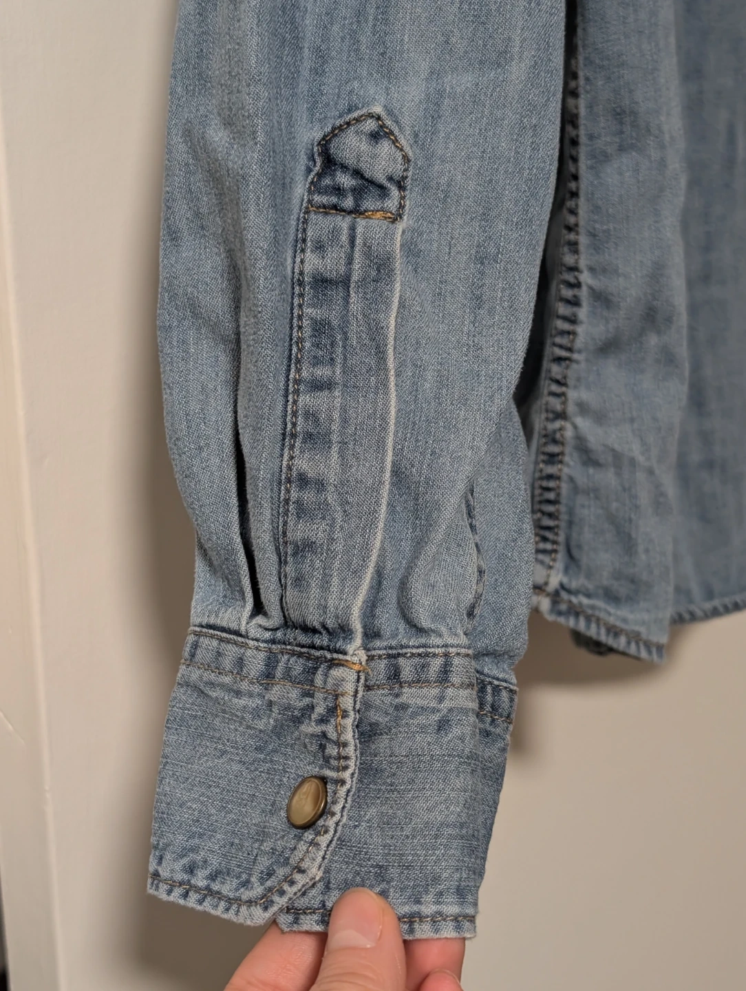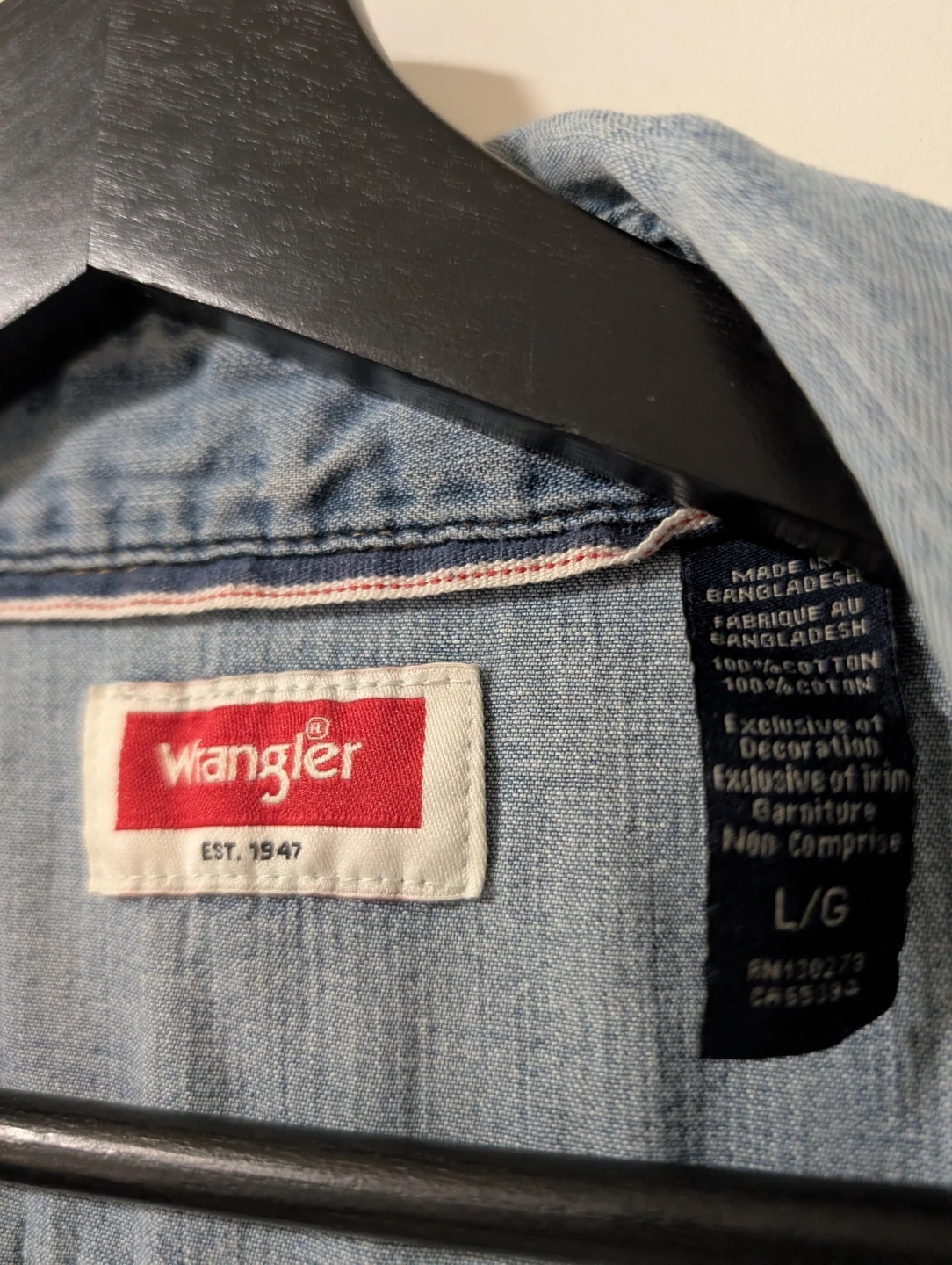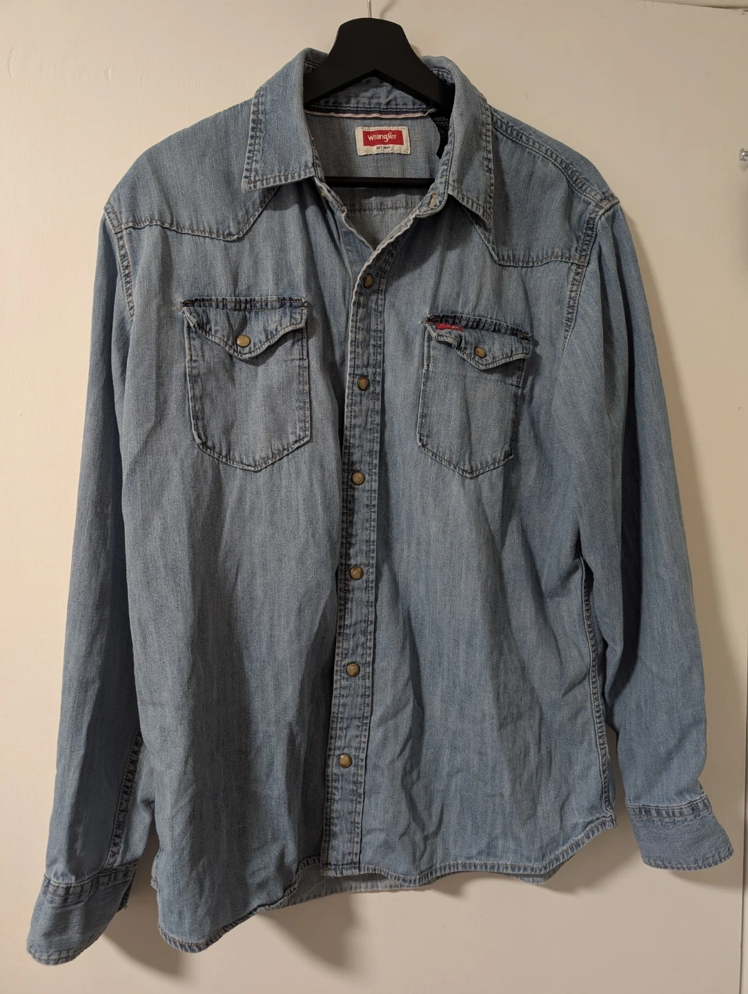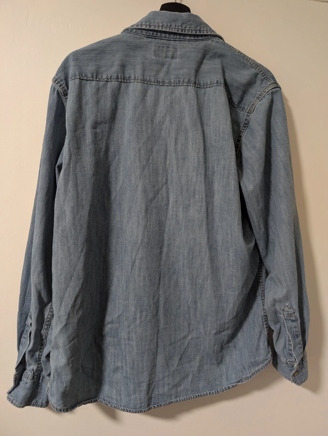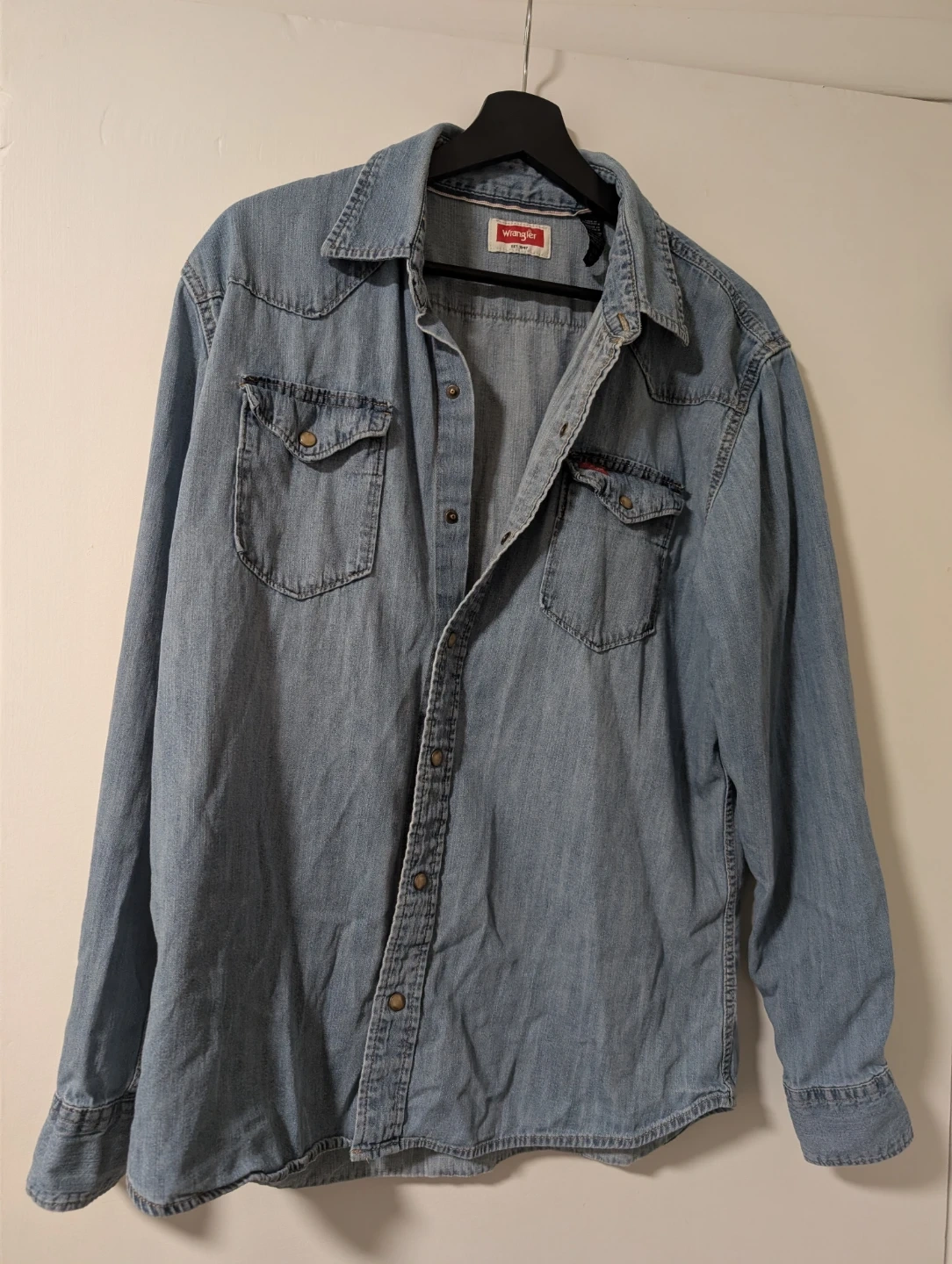 Selling a Wrangler denim western shirt in size large. It's made of 100% cotton. Perfect for a casual look!