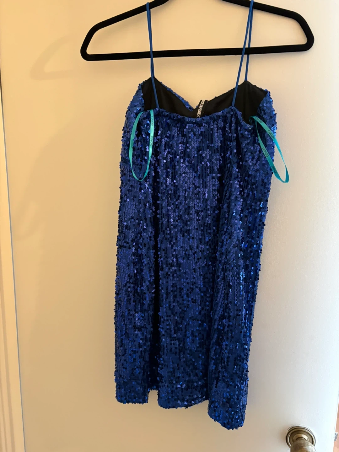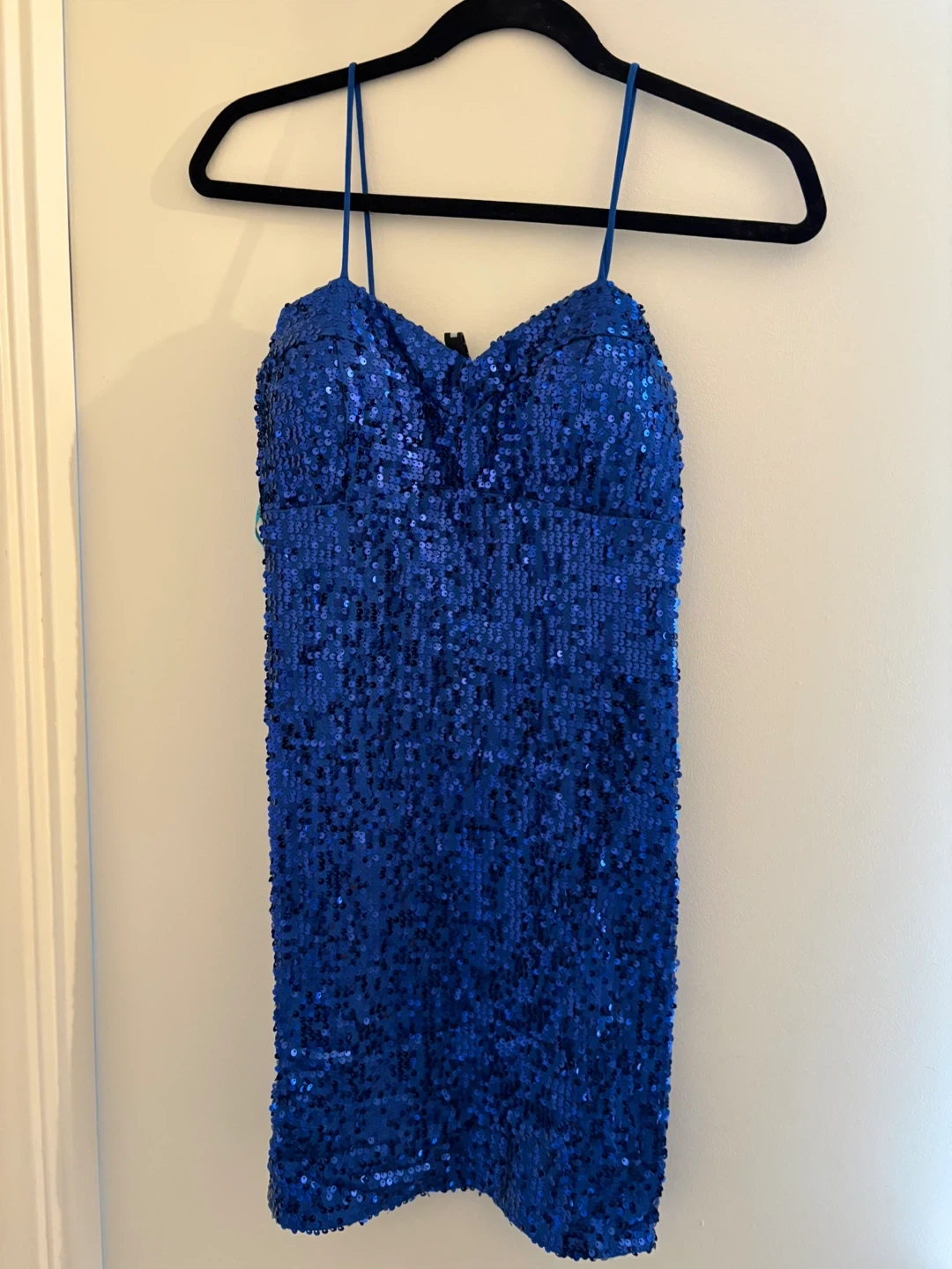Jolie robe bleue à paillettes, parfaite pour une soirée! Elle est en bonne condition et très scintillante. N'hésitez pas à me contacter si vous avez des questions!