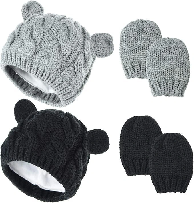 Super cute baby bear hat and mitten set! Perfect for keeping your little one warm and cozy. Includes one hat and a pair of mittens in both grey and black colours. Great for ages 0-6 months