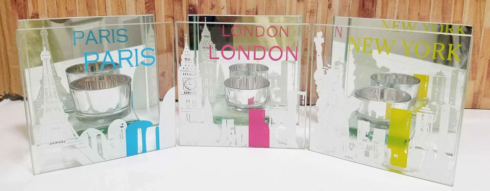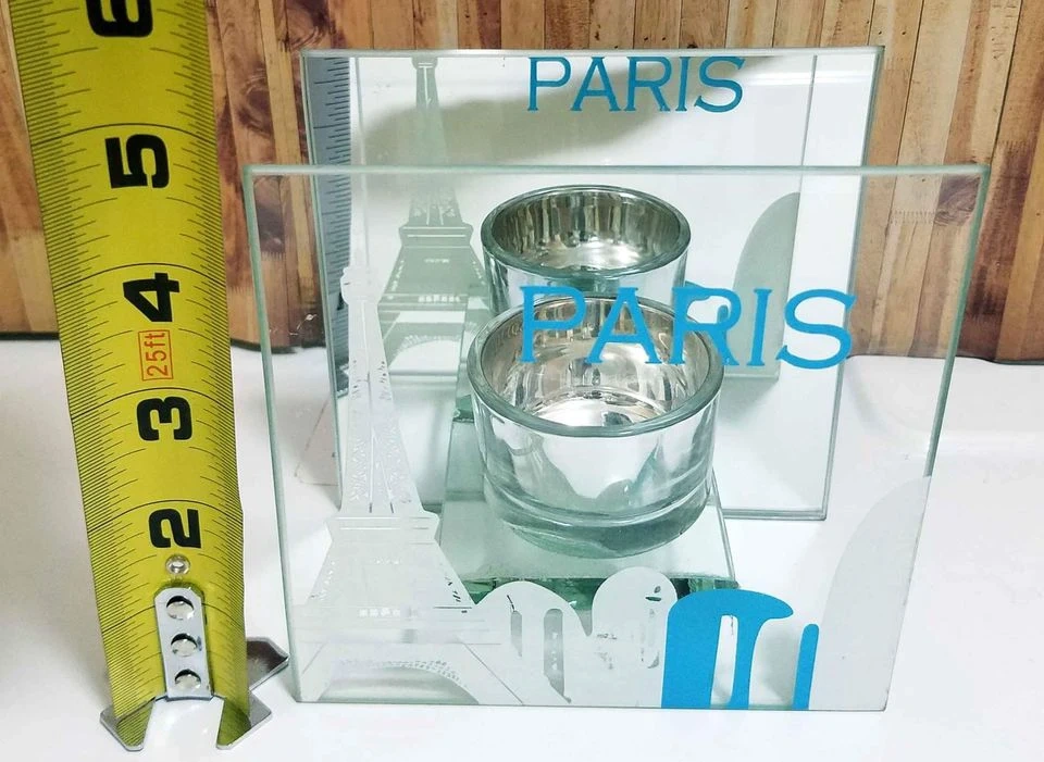 Add a touch of worldly charm to your space with these unique glass candle holders, each representing iconic cities: Paris, London, and New York! These candle holders are in great condition. They each stand approximately 5 inches tall, making them perfect for shelves or tables.