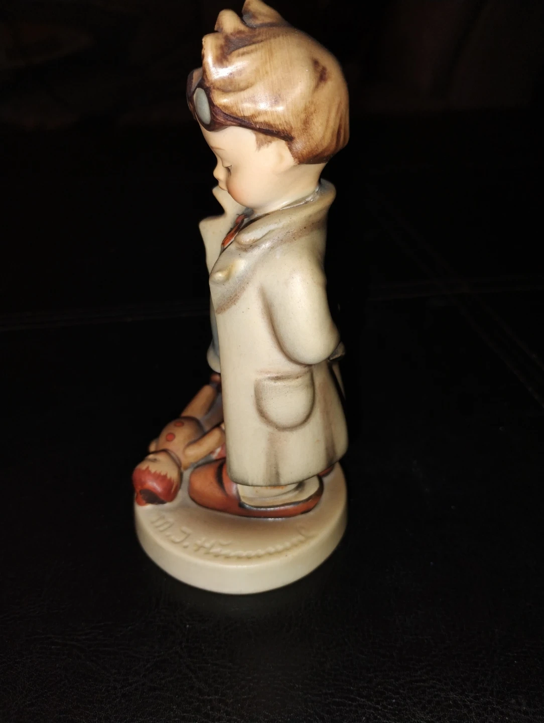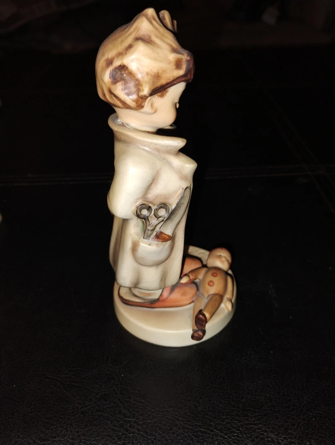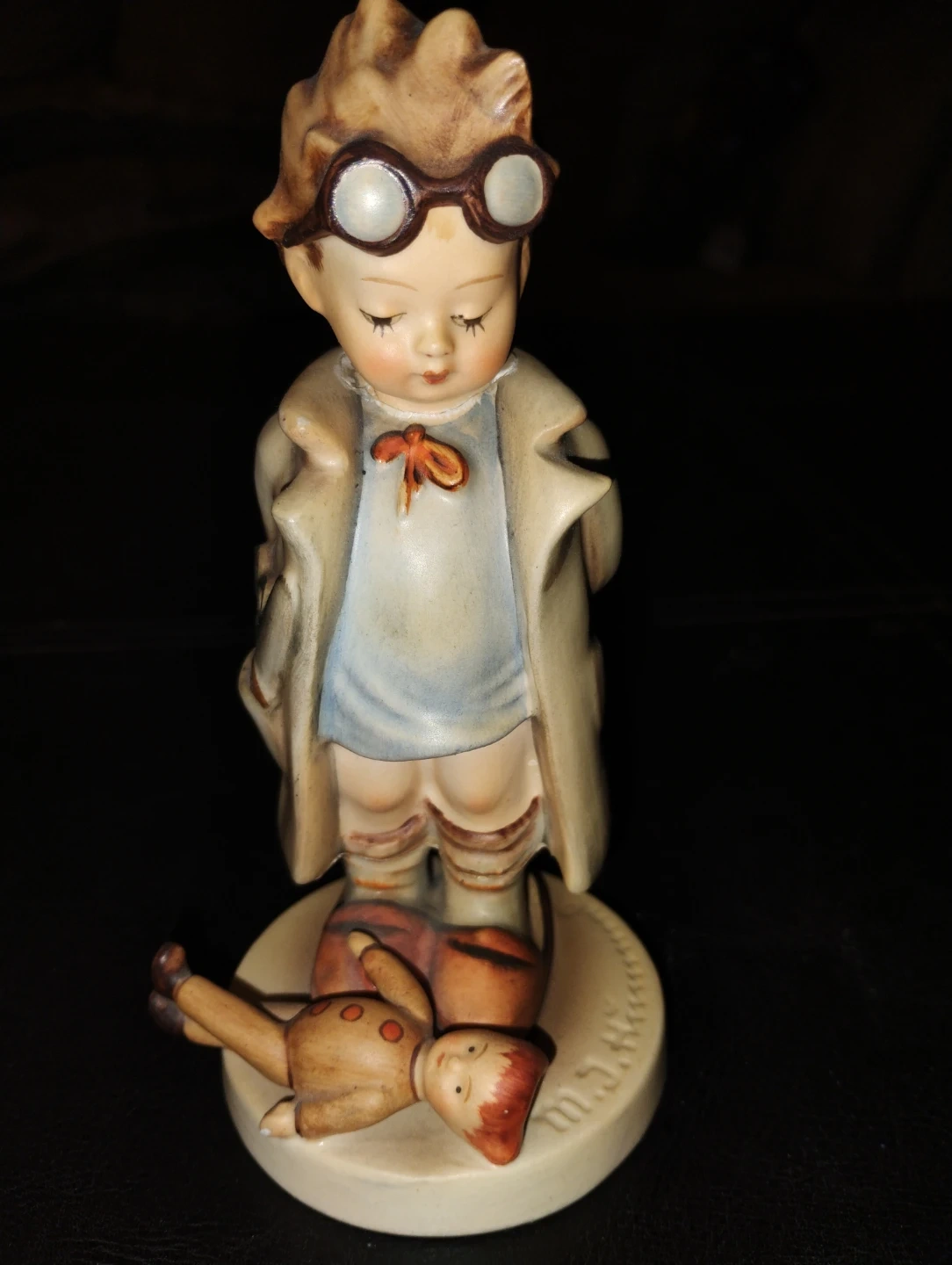 Vintage Goebel Hummel figurine, depicting a boy dressed as a doctor with a fallen doll. It has a charming, classic design. The figurine is marked with "Germany" on the bottom.