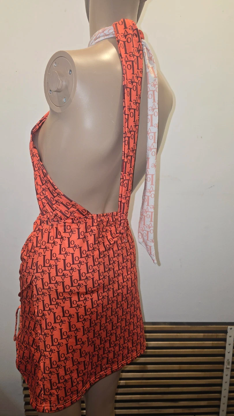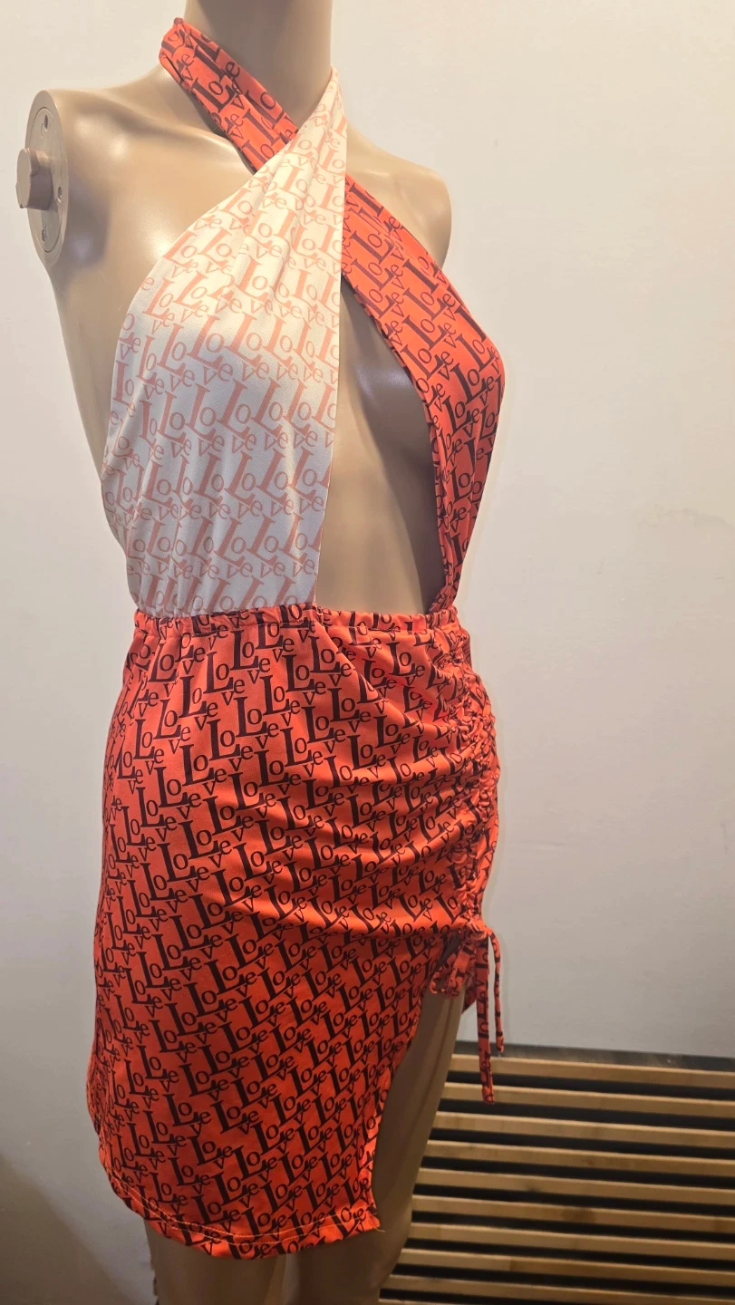 This halter mini dress features an eye-catching orange and white LOVE print. It has a stylish halter neckline and a ruched skirt with a side slit. Perfect for Valentines day or a special occasion!