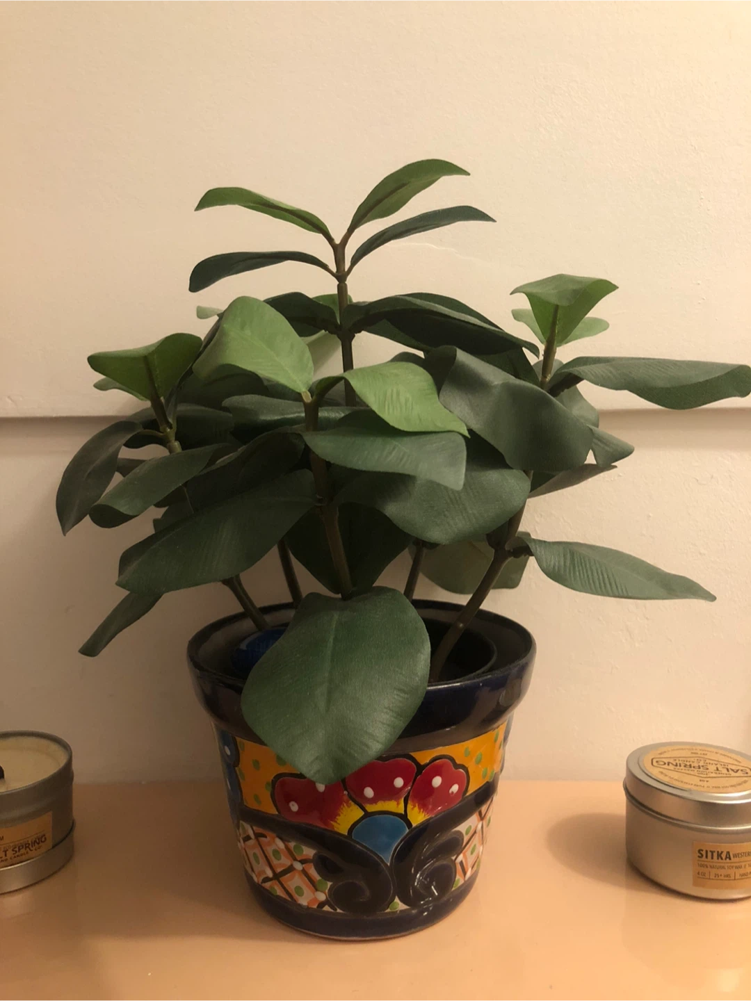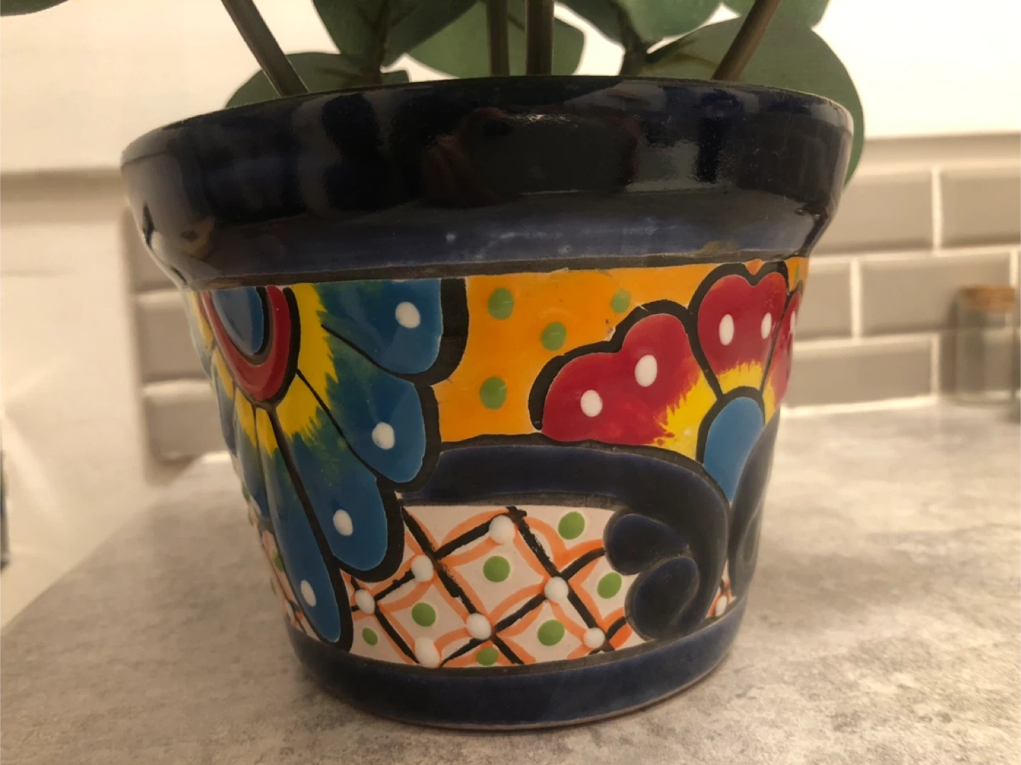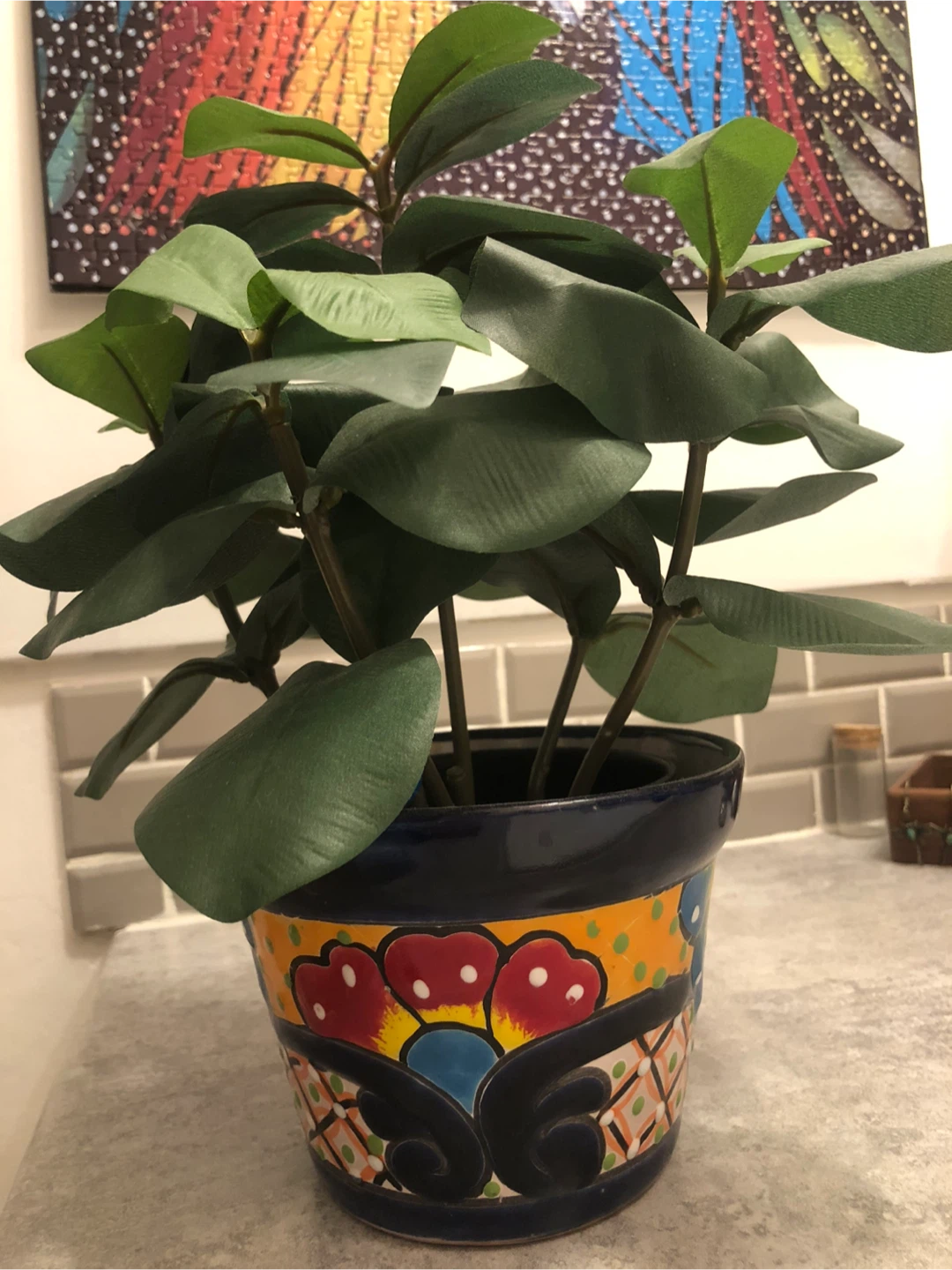 Selling a lovely decorative plant in a colourful pot, 2 separate items, selling together! It's in great condition and would look great in any room. The pot has a beautiful, vibrant design with red, yellow, blue, and green accents. Perfect for adding a touch of colour to your home!