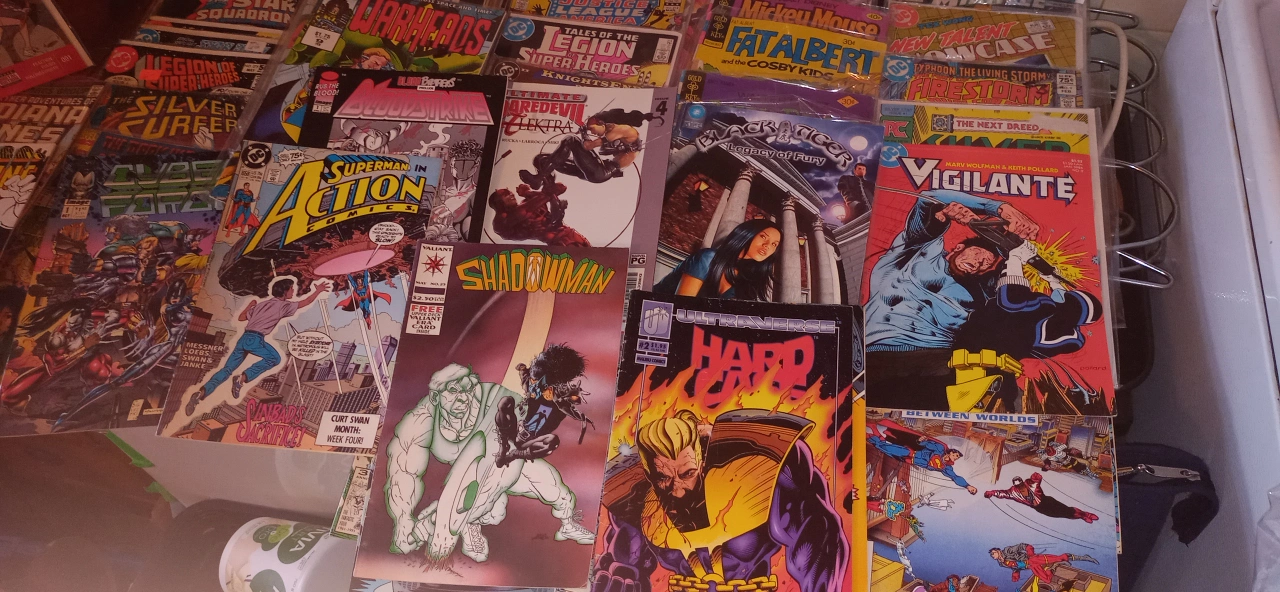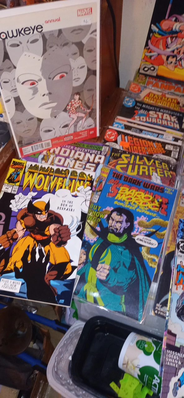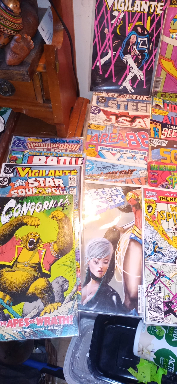There is around 100 vintage comics in excellent condition. Most of them are worth $5 to $20 each. Everything from Batman,Superman, Justice League, Robin, Sub Mariner,Indiana Jones, Alpha Flight, Formic Wars, Siverstar, Firestorm, Green Lantern,Mister Miracle, Area 88, Andy Panda, Fat Albert,Mickey Mouse, The Legion of Superheros, Justice League of America, Fantastic Four, Dr, Strange, Silver Surfer, The secret six,Steel, X Factor, and many many more!!!. All Vintage.The whole box is worth over $1000+. I'm asking $250. takes all. 97%are in bags. Somme singles for a fact are worth $50+ easy. This is a great investment. They only go up in price with time. Must pick up. This will go fast....Happy New Year! Jim.