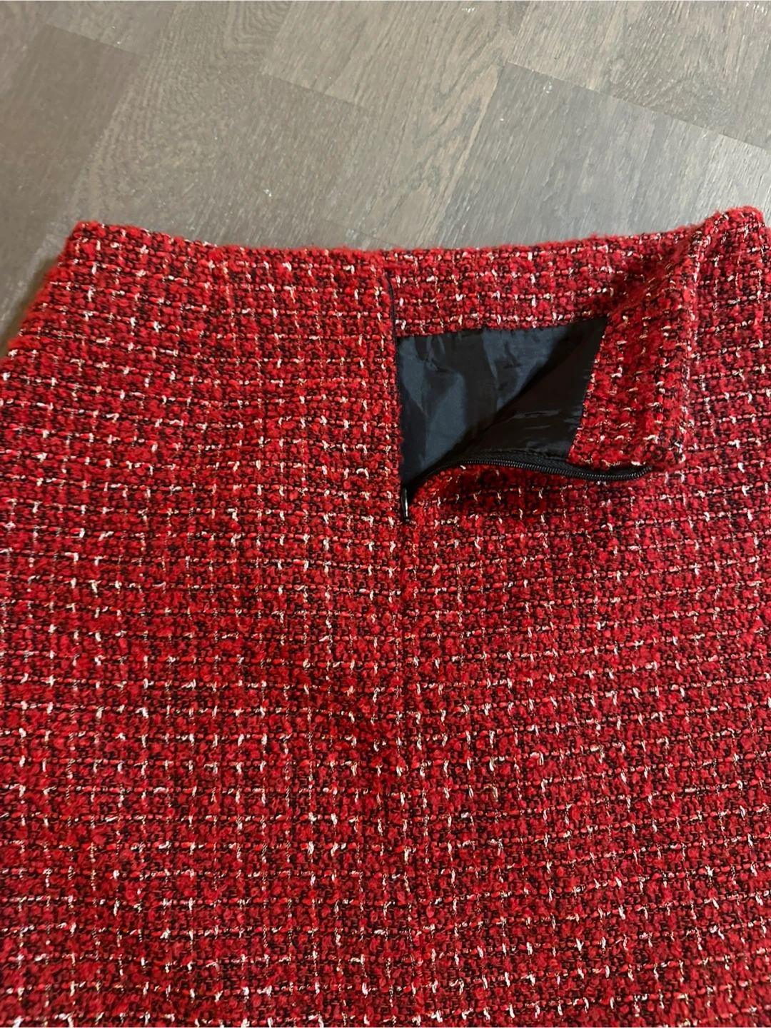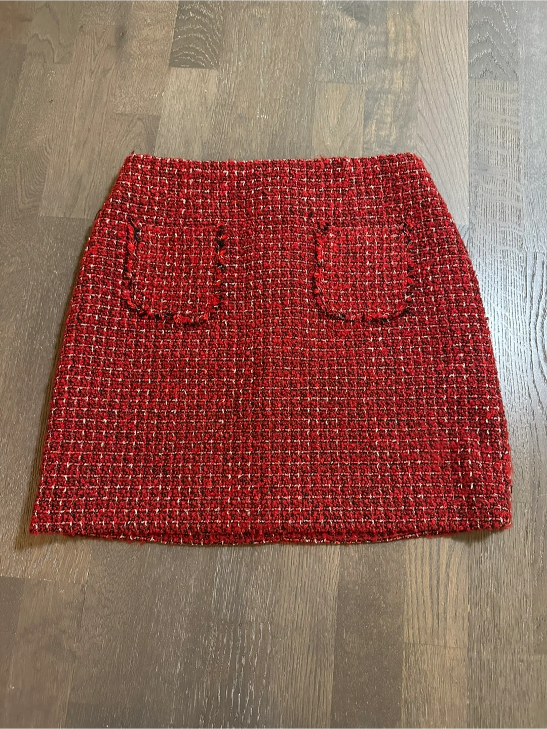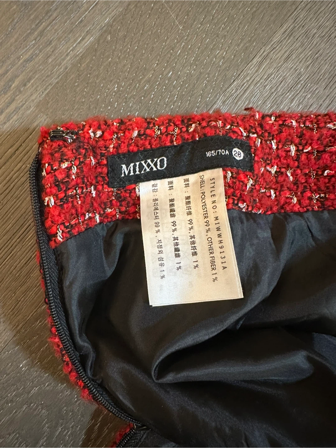 Selling a cute red tweed mini skirt from Mixxo! It's a size 28 and made of polyester and other fibers. Perfect for adding a pop of color to your wardrobe