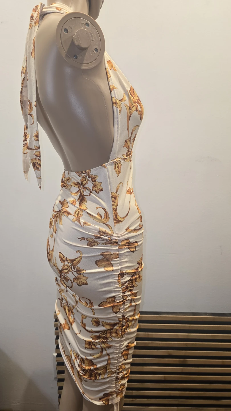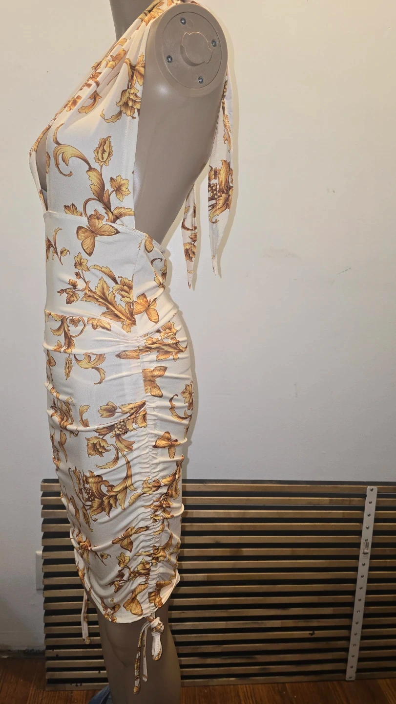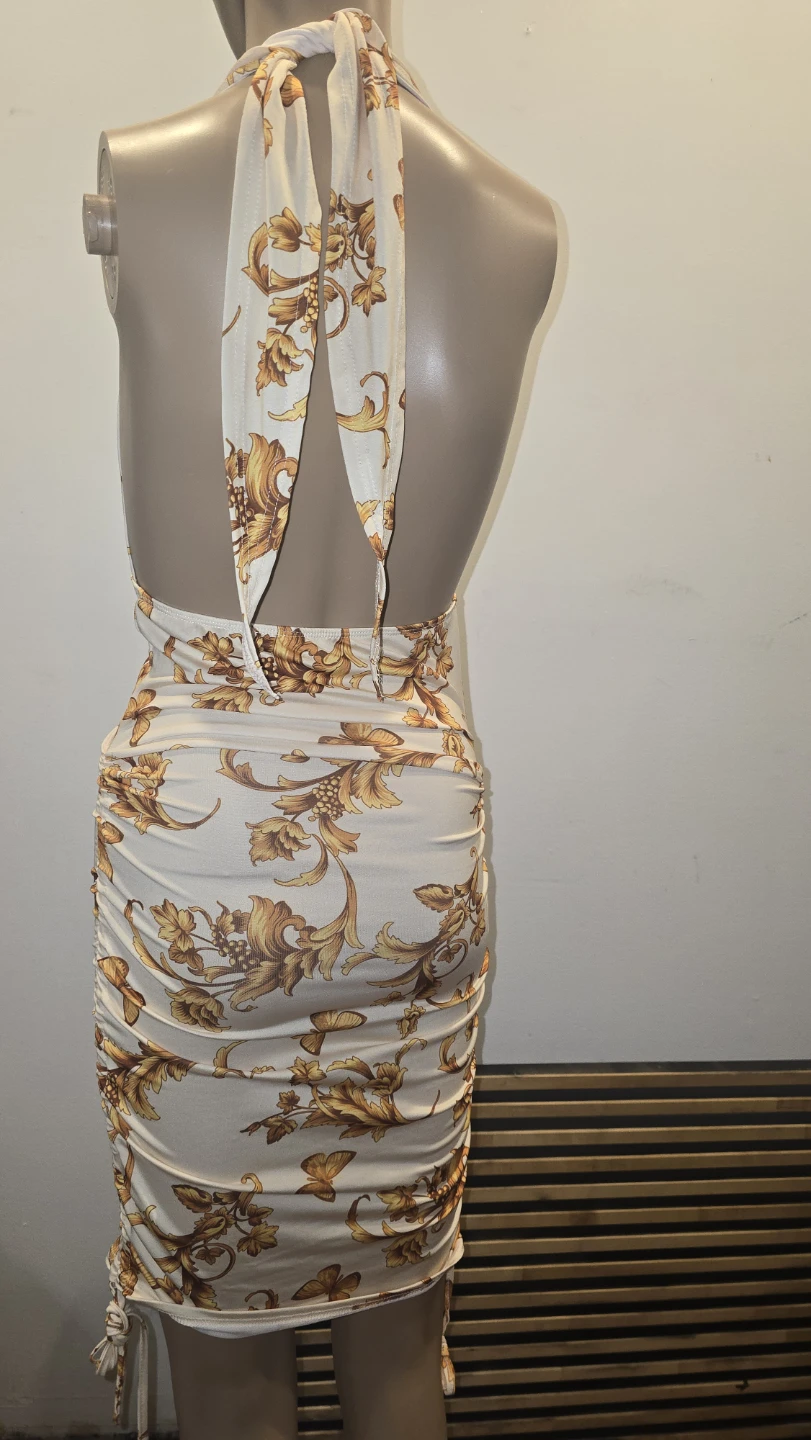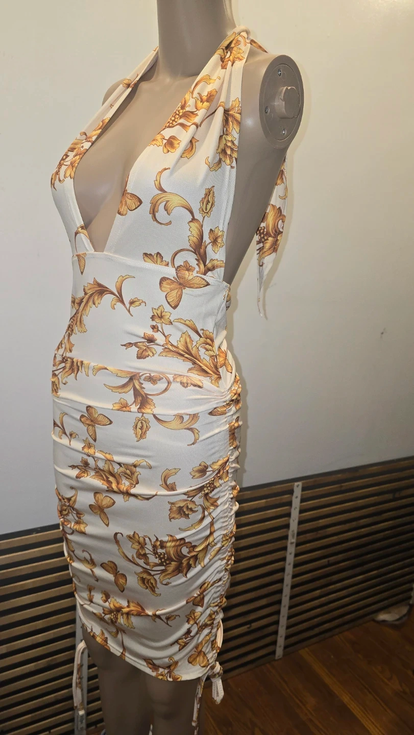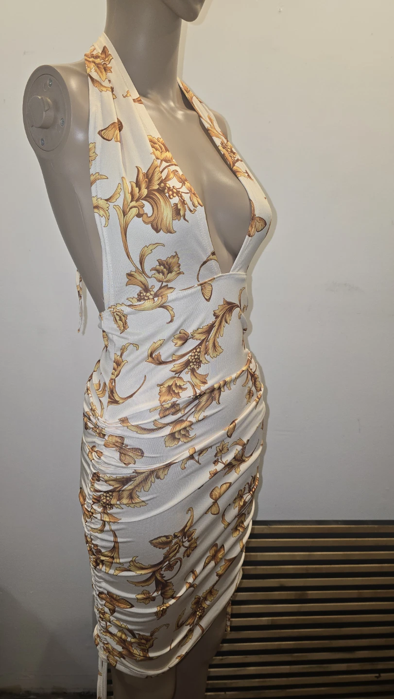 This elegant halter mini dress with a royal gold floral print. It features a deep V-neck and a ruched adjustable bodycon sides. Perfect for a night out!