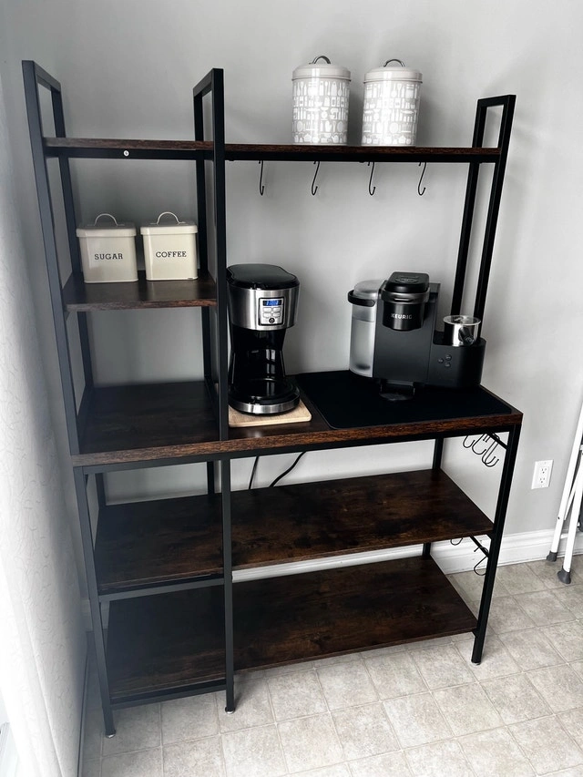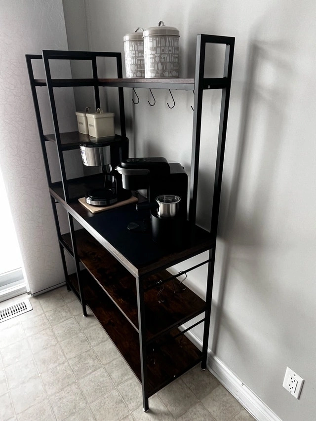 Elevate your kitchen or dining space with this bakers rack, featuring a sturdy metal frame and rustic brown shelves perfect for storage or display. This unit is in used but good condition. I'm selling it because I am redecorating.