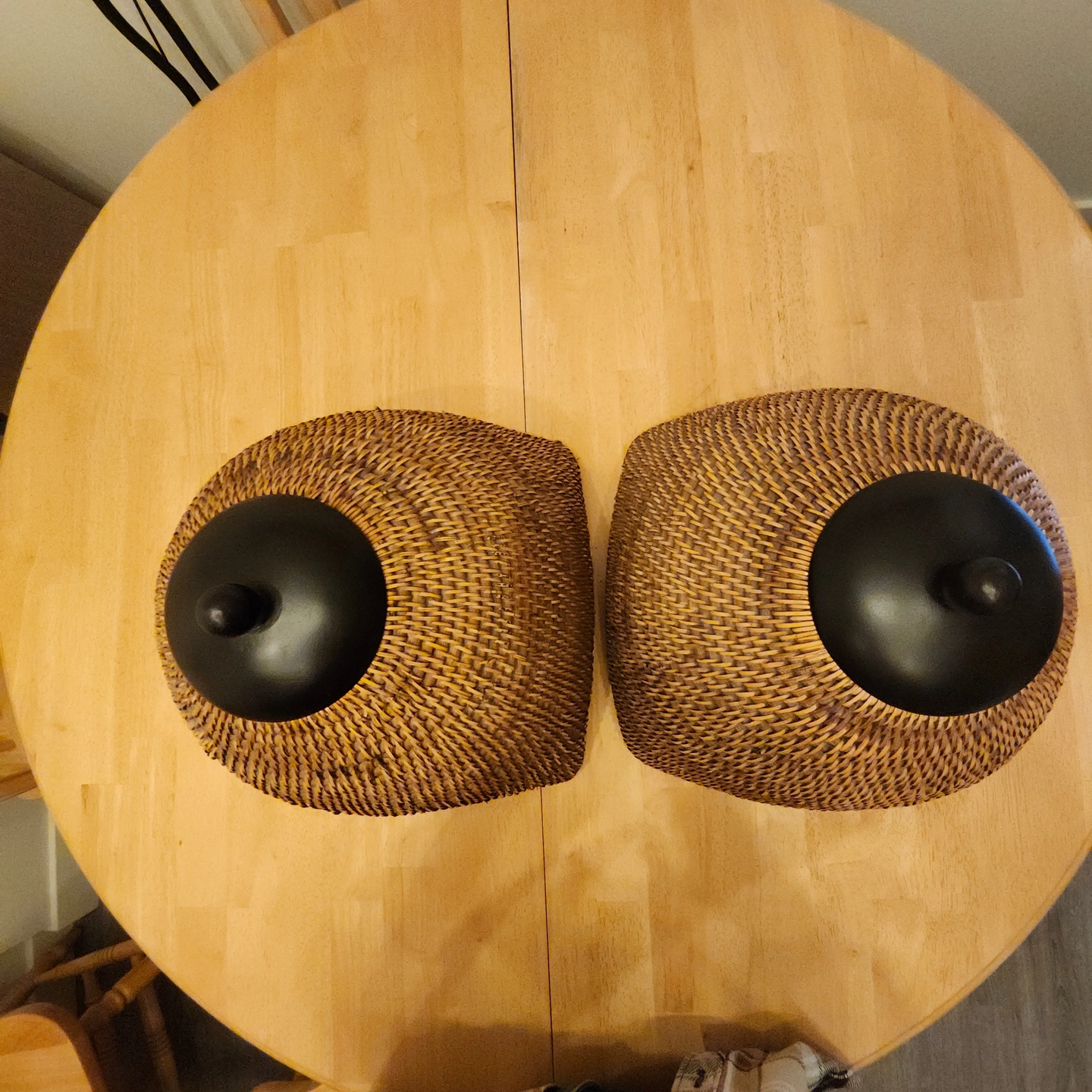 These are unique honey brown colored, woven rattan baskets. They are very sturdy and do not flex.