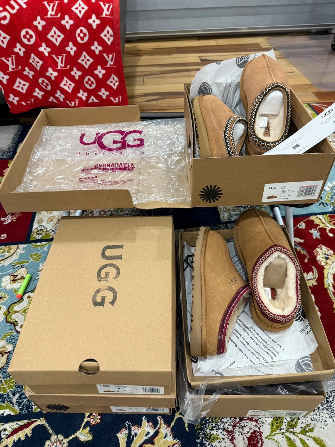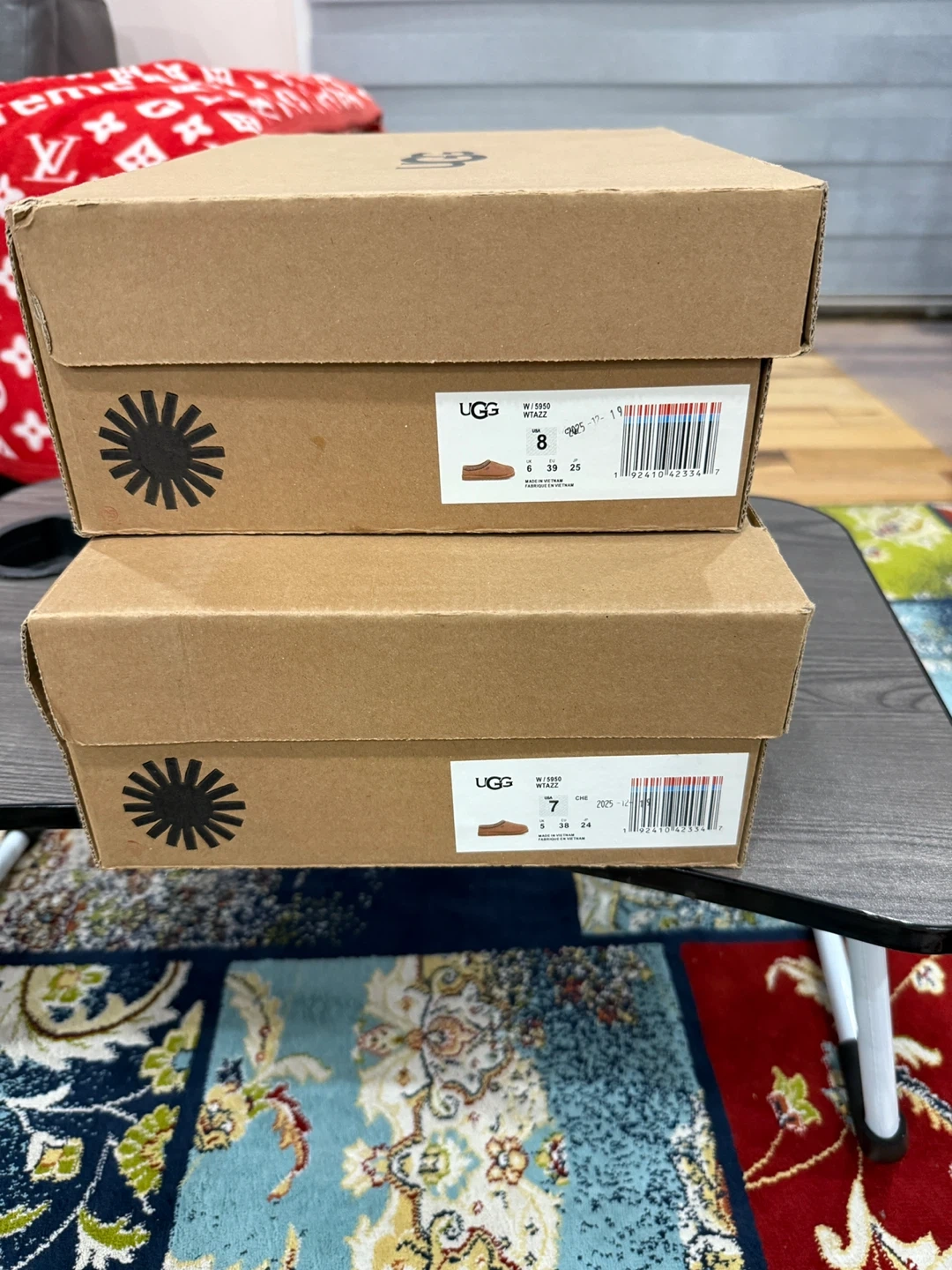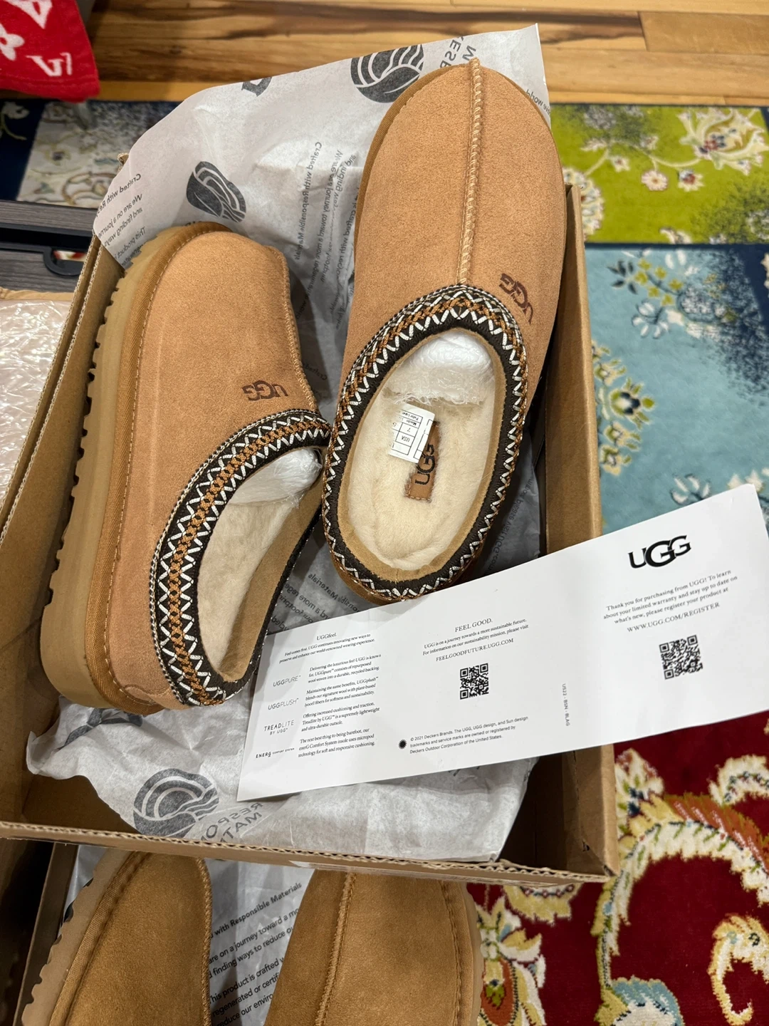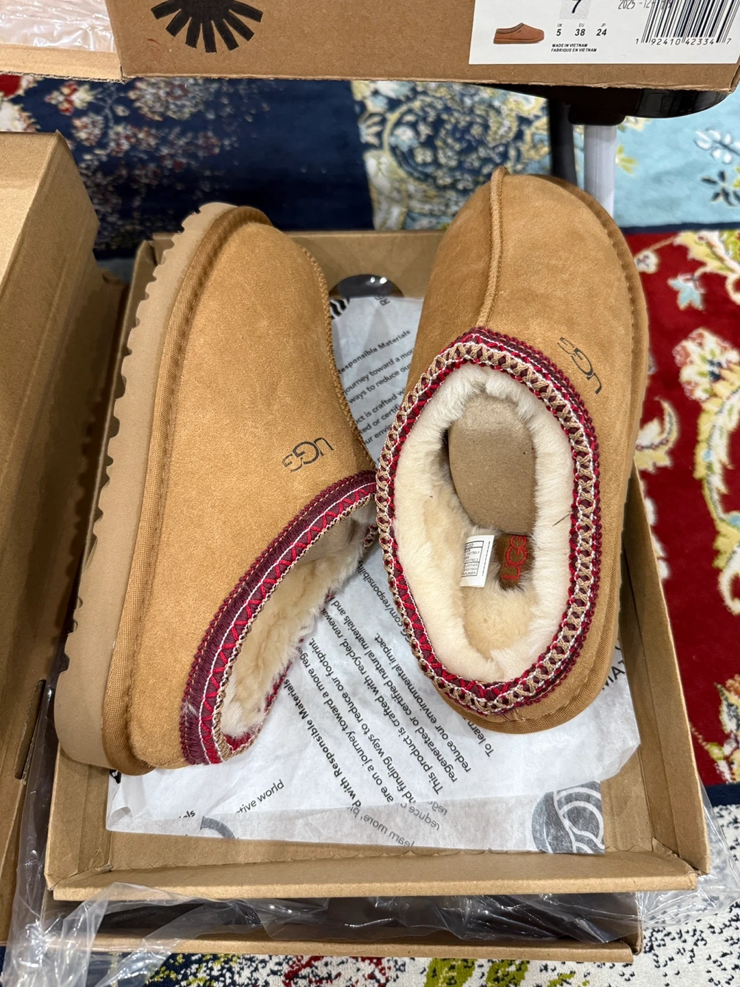 UGG Tasman slippers for women, size 7 and 8 . These are in great condition and come with the original box. They're super comfy and perfect for wearing around the house. The slippers are a stylish tan colour. Get ready for cozy season!