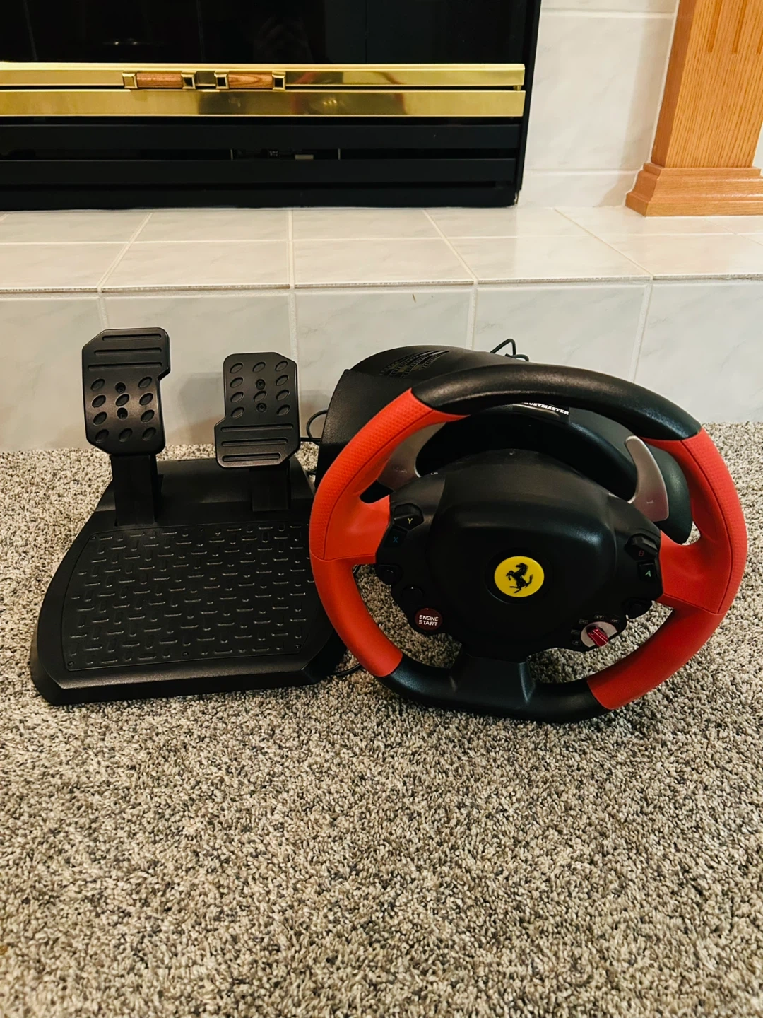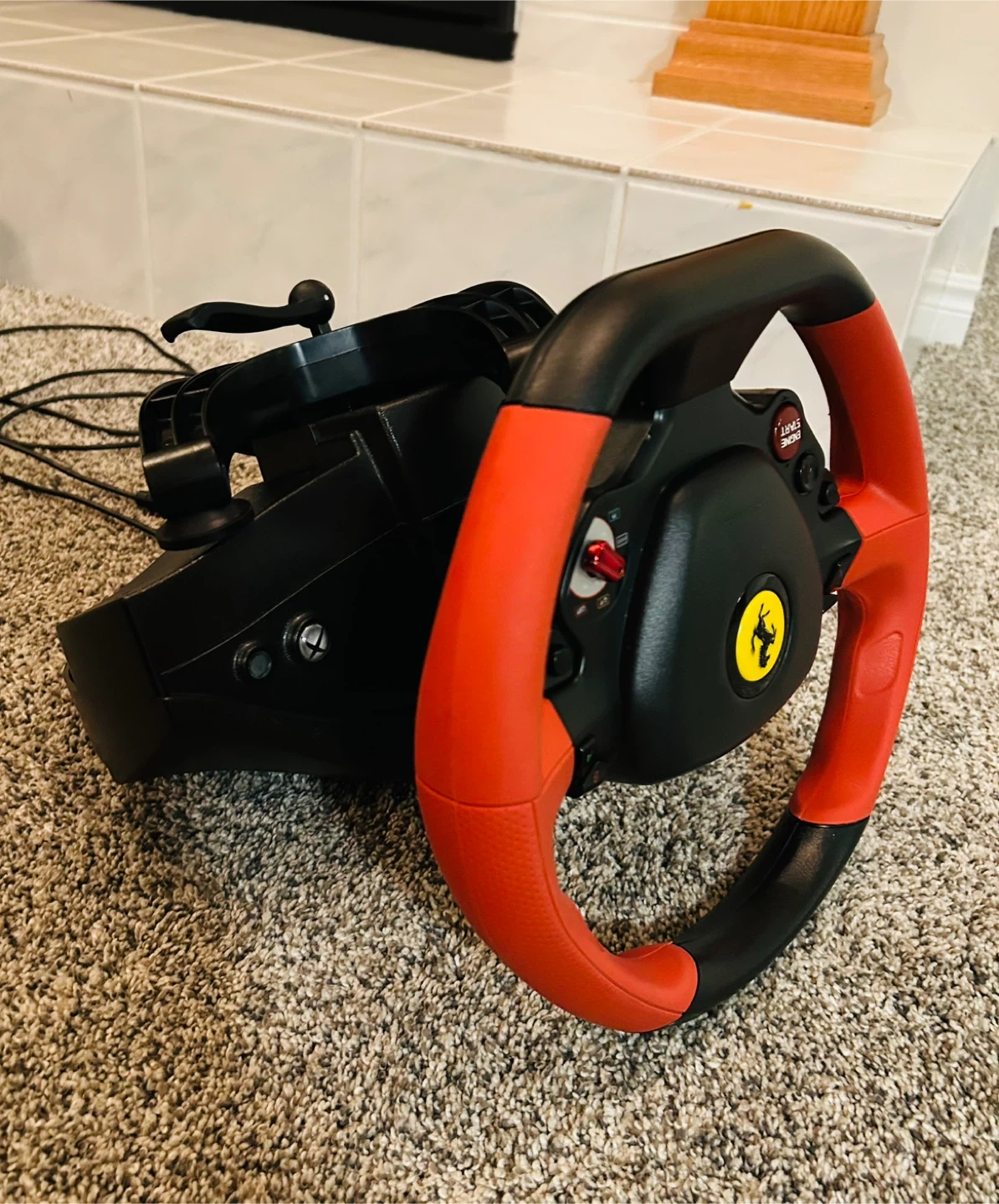 Excellent condition Ferrari racing wheel compatible with Xbox. Comes with foot peddles and steering wheel with a clamp for set up on a desk or table. Includes usb cable.