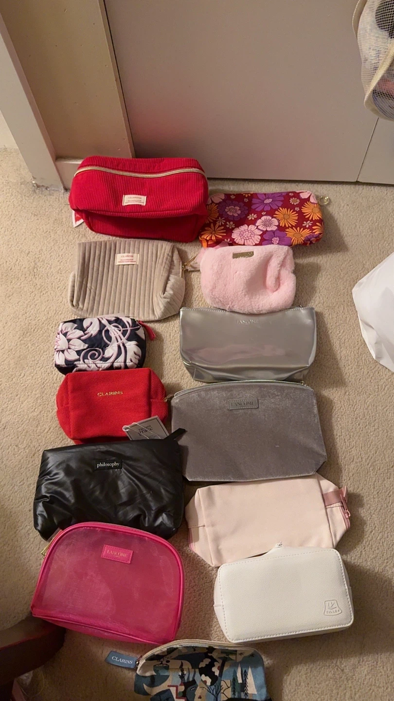 Selling a collection of various cosmetic bags from brands like Clarins, Lancome, and Philosophy. They come in different colours, sizes, and materials. Great for organizing your makeup and toiletries! $4 each , any 3 together for $10.