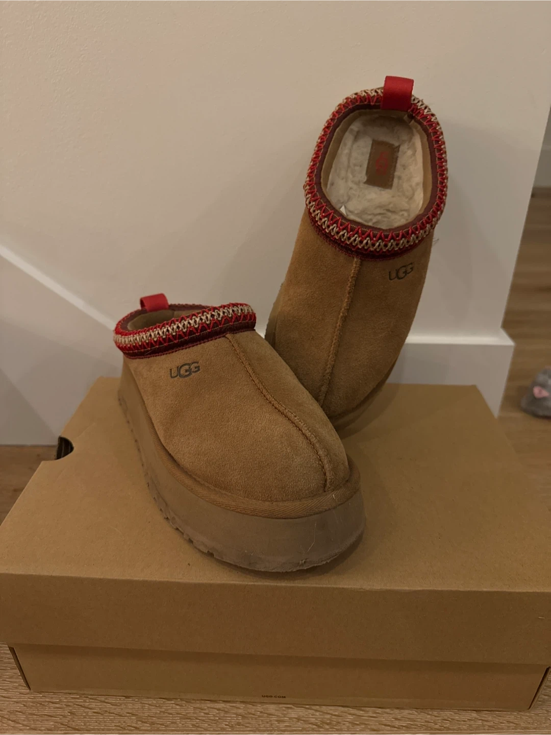 Selling a pair of UGG slippers. These are a stylish and comfy option for indoor or outdoor wear. Comes with the original box