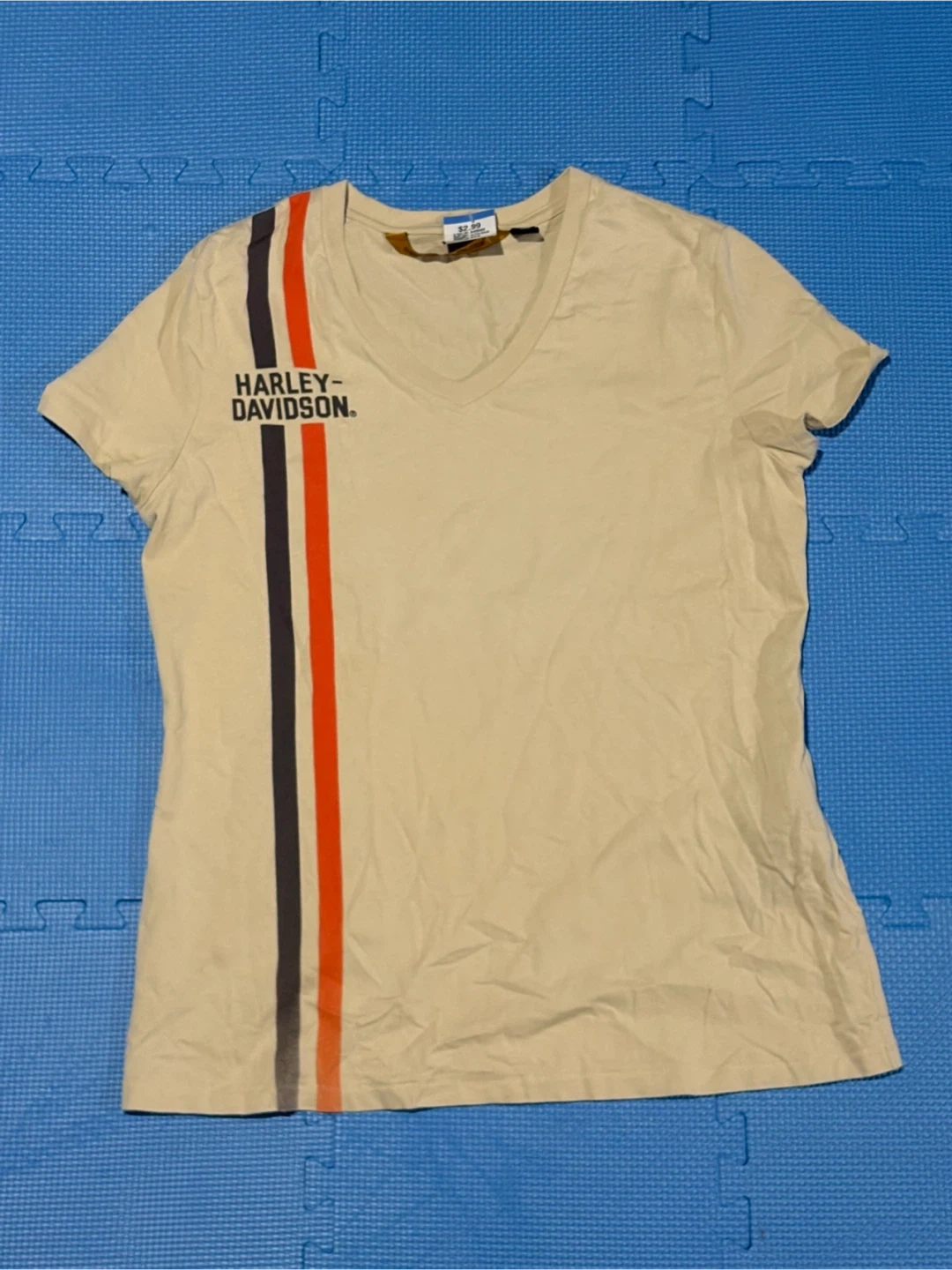 Harley-Davidson Motorsports National Champions tee! It's a cream colour, with black and orange stripes on the front. The back has the Harley-Davidson logo and "Motorsports National Champions"
