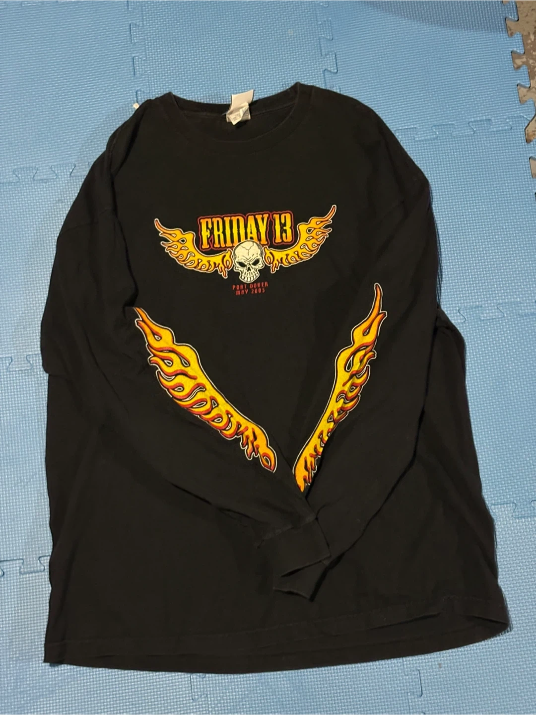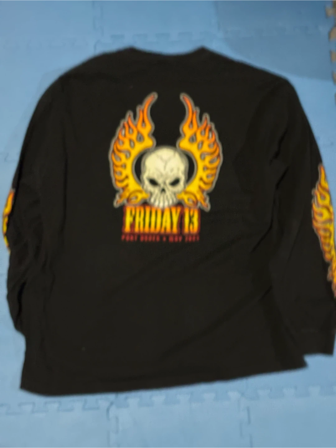 Selling a black long sleeve Friday the 13th shirt with flaming skull design. It's in great condition!