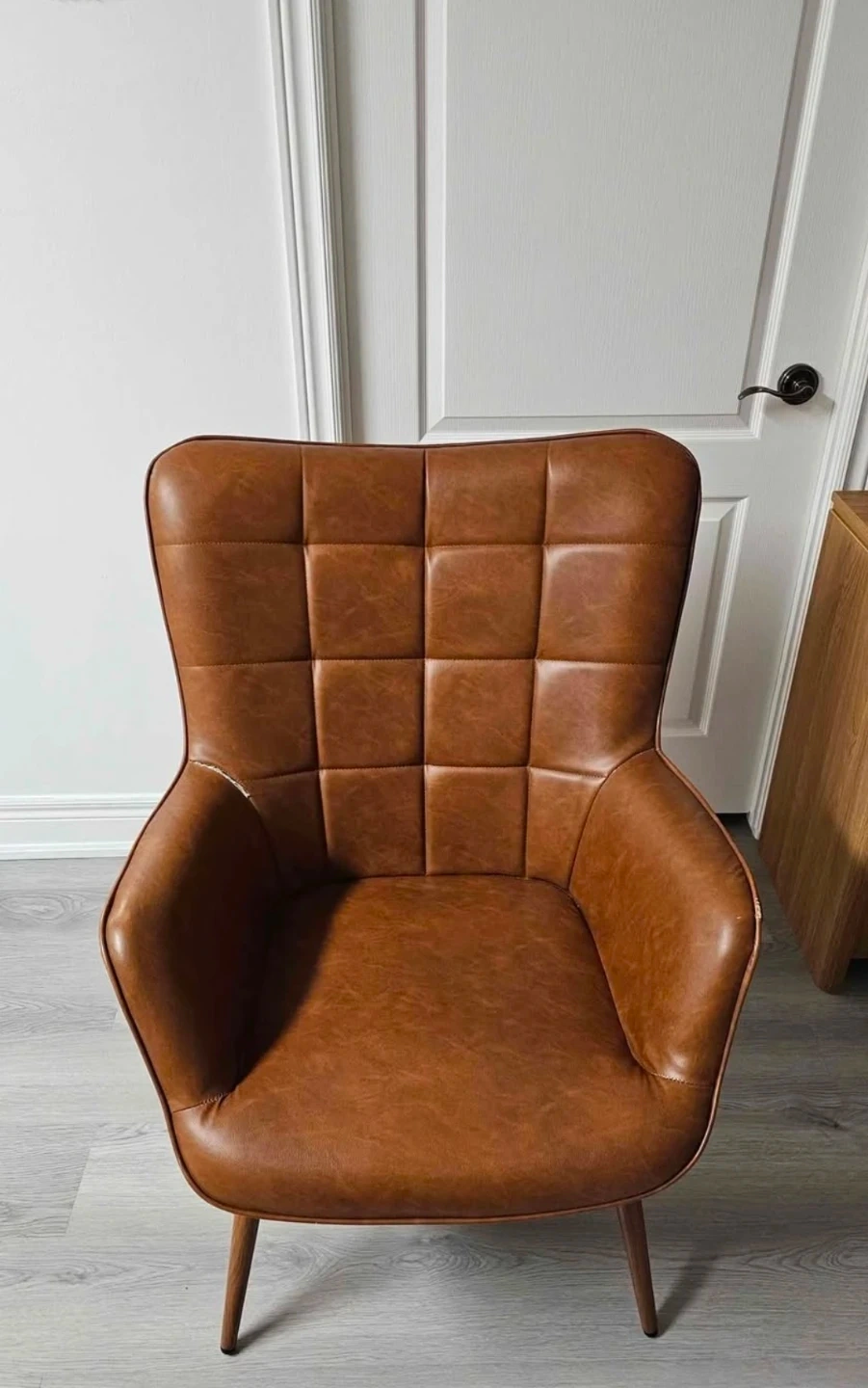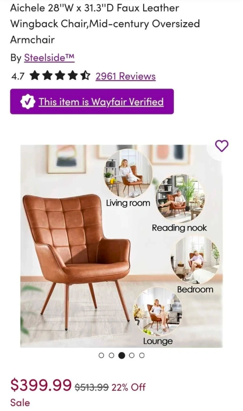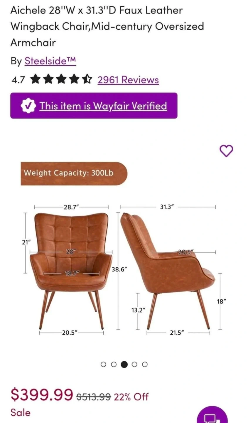 Selling a Steelside Aichele 28"W x 31.3"D Wingback Chair in brown faux leather. This mid-century oversized armchair is in great condition. Originally bought for $399.99. It can hold up to 300 lbs.