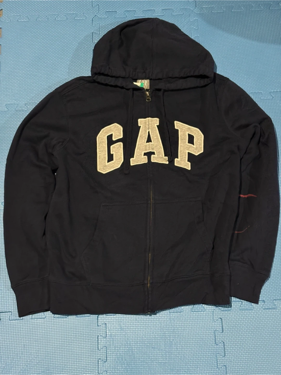 Selling a GAP full zip hoodie in navy. It has the GAP logo across the chest and a full zipper. There are some signs of wear.