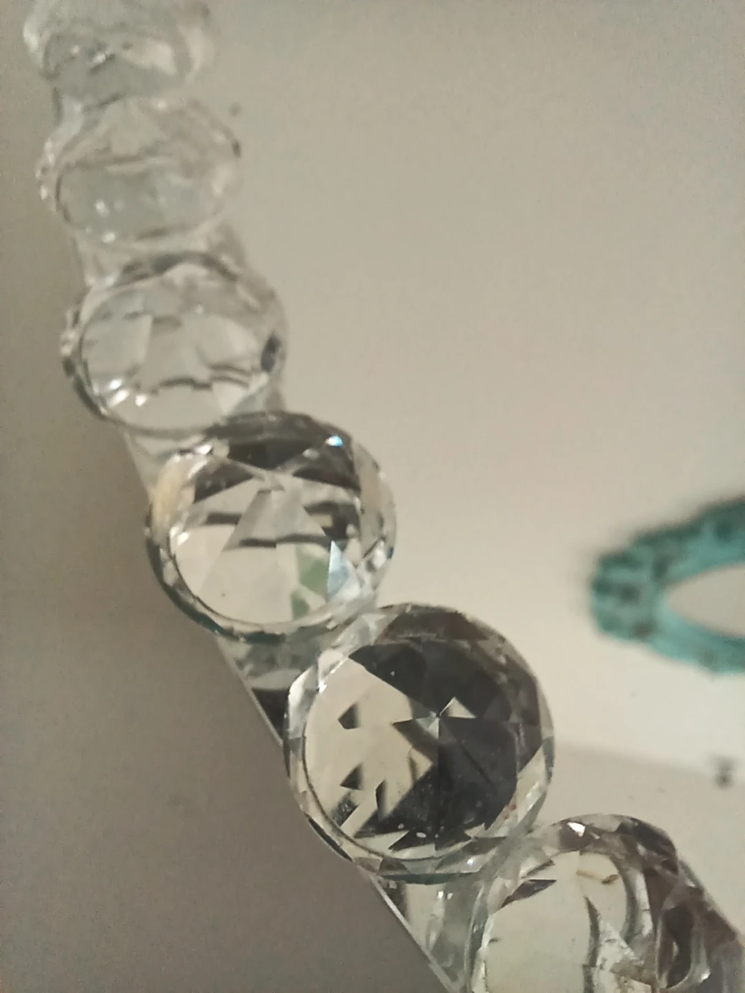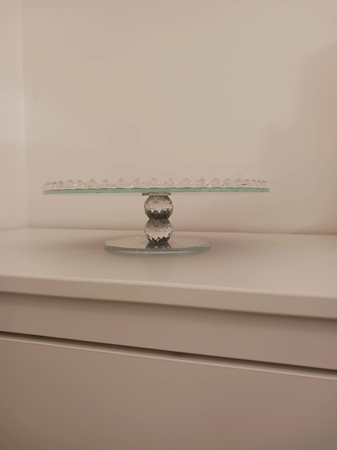 Elegant glass cake stand featuring a mirrored surface and crystal-style bead trim around the edge. Ideal for cakes, cupcakes, desserts, pastries, or event displays. Clean and in good condition with no cracks or chips noted.