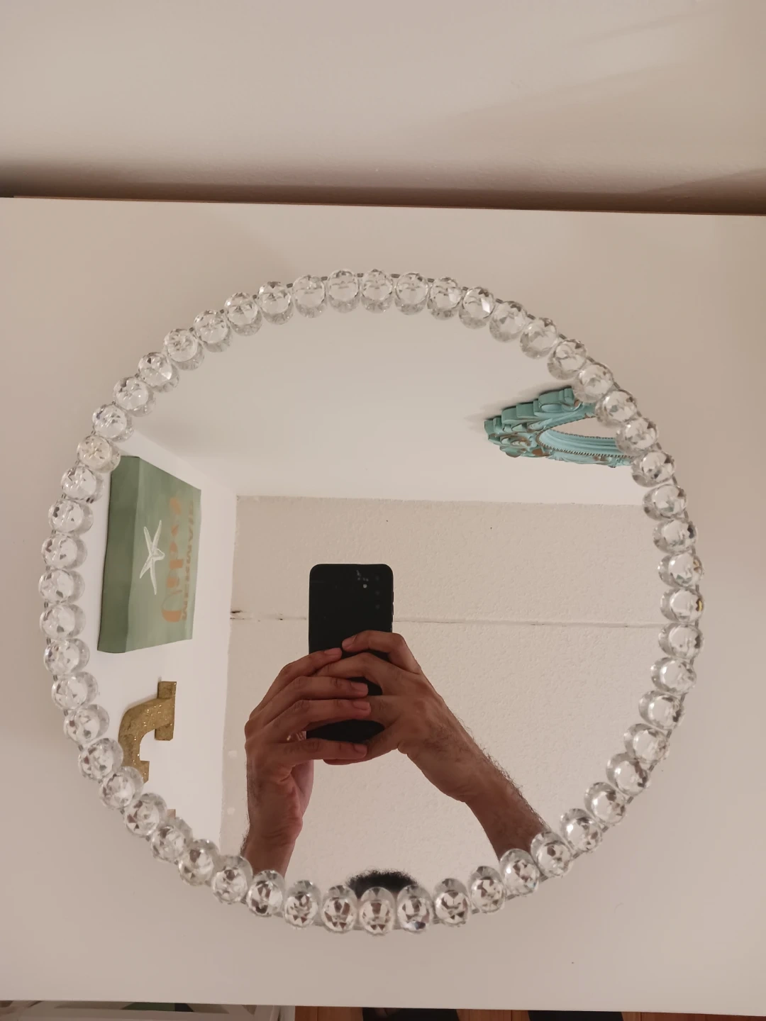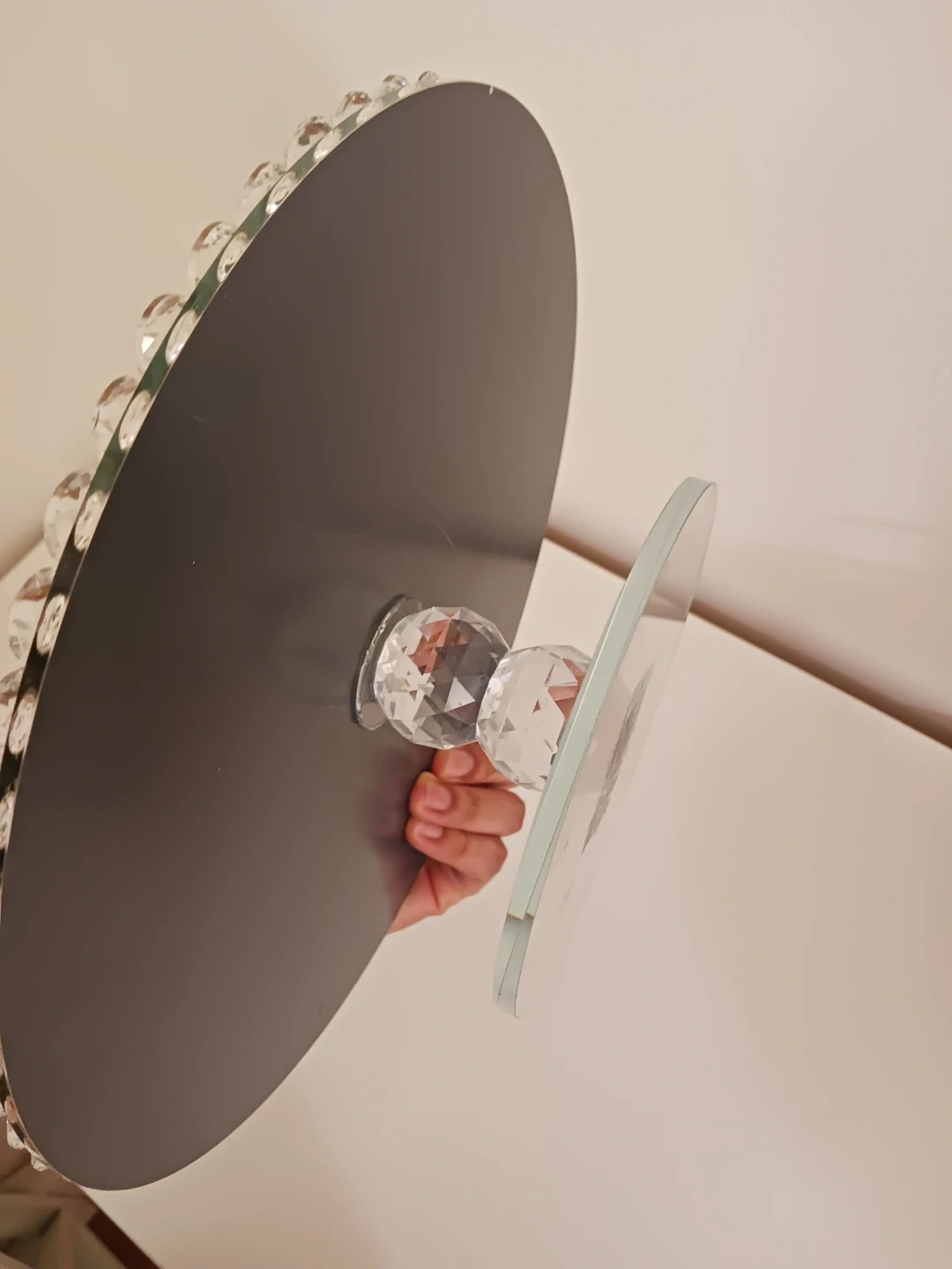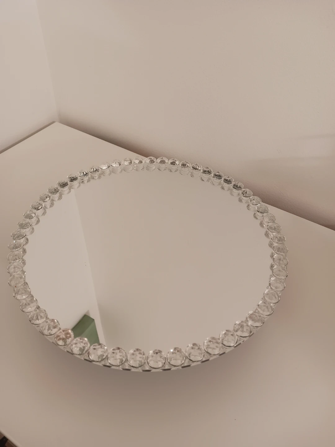 Elegant glass cake stand featuring a mirrored surface and crystal-style bead trim around the edge. Ideal for cakes, cupcakes, desserts, pastries, or event displays. Clean and in good condition with no cracks or chips noted.
