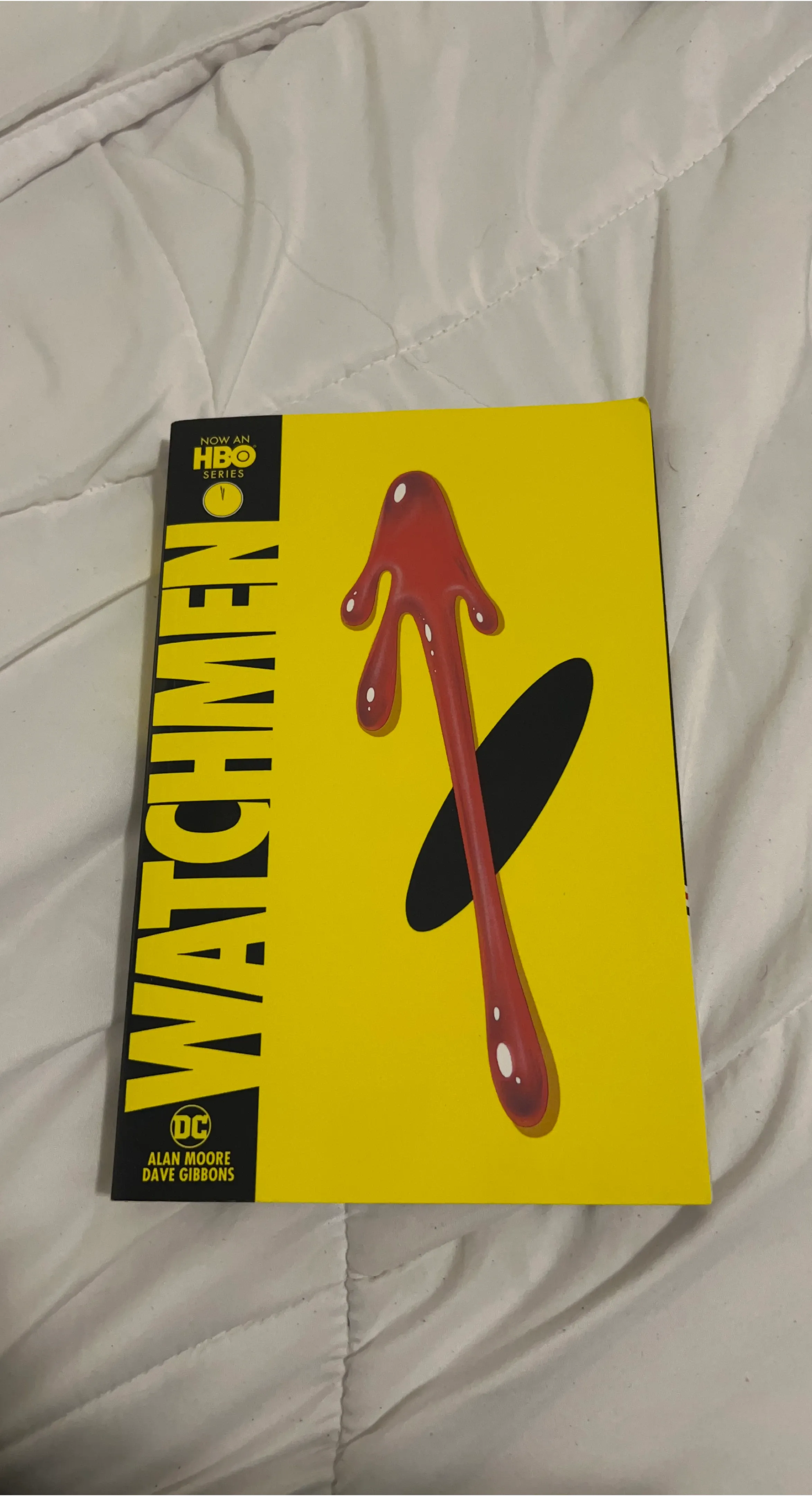 Selling a copy of Watchmen Volume 1, a trade paperback collecting the first few issues of the acclaimed comic book series. It's published by DC and written by Alan Moore and Dave Gibbons. This edition is branded with the HBO series logo.