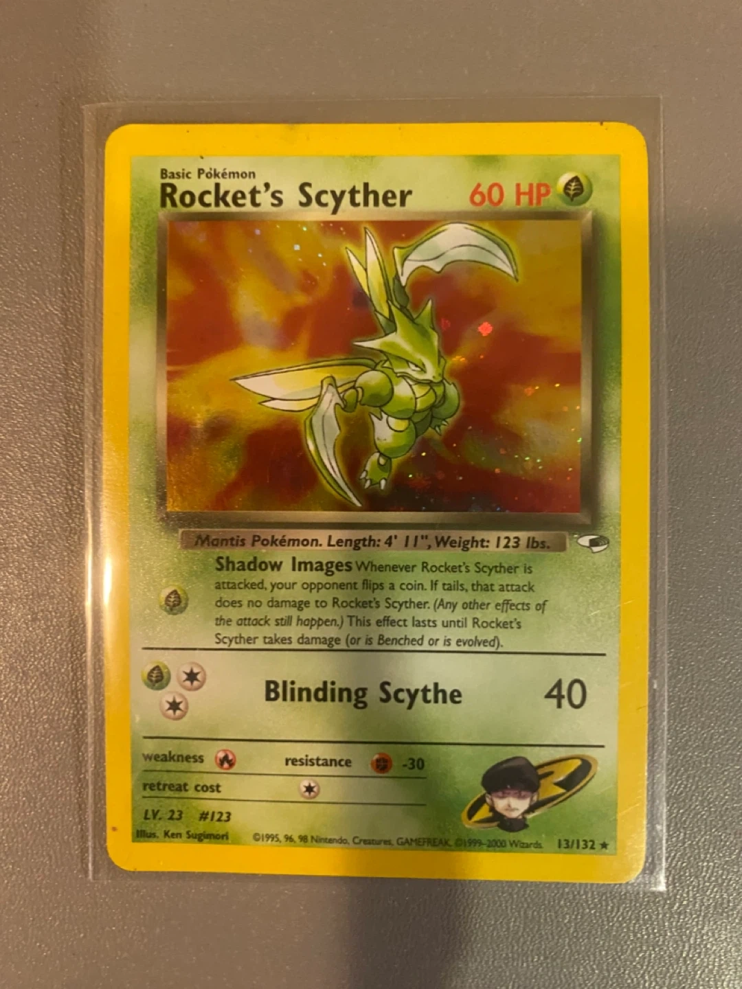 Selling a Rocket's Scyther Pokemon card. It's in heavily played condition but still holds high value and ready for a new collector!