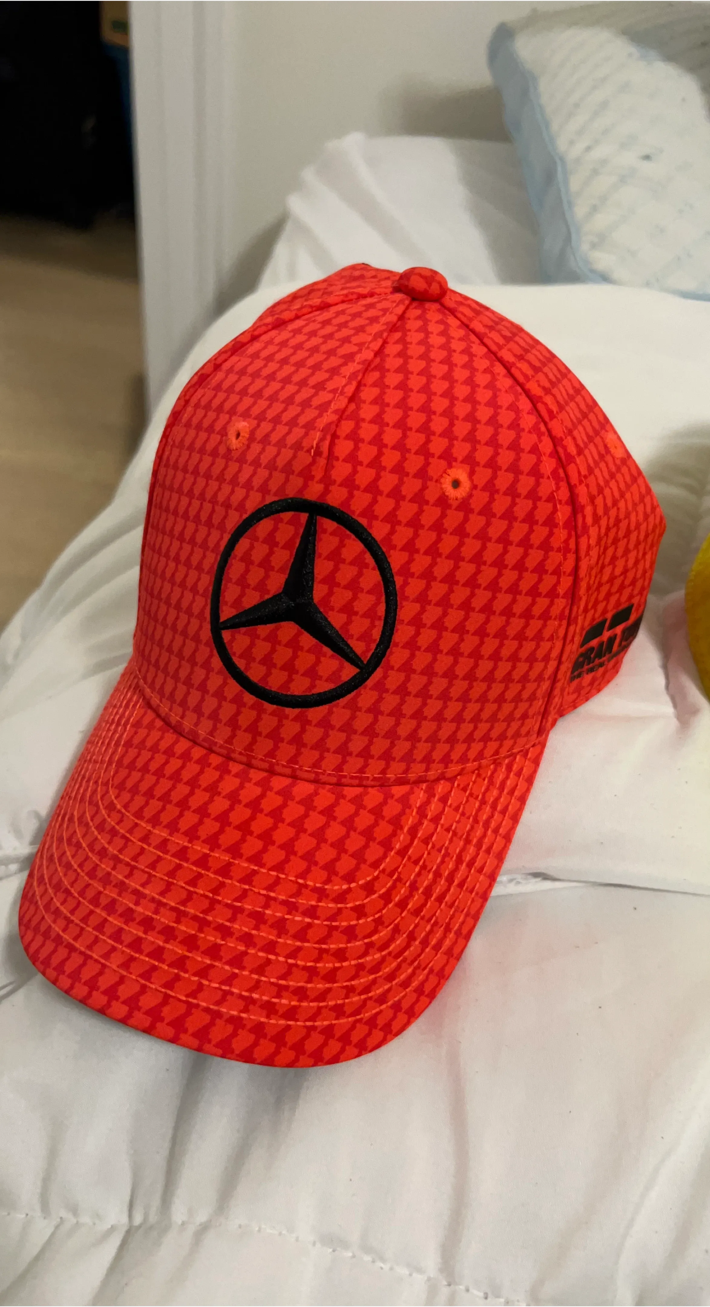 Selling a Mercedes-AMG Petronas Formula One Team hat! It features a vibrant orange colour with a subtle patterned design and the Mercedes logo prominently displayed. Perfect for any F1 fan!