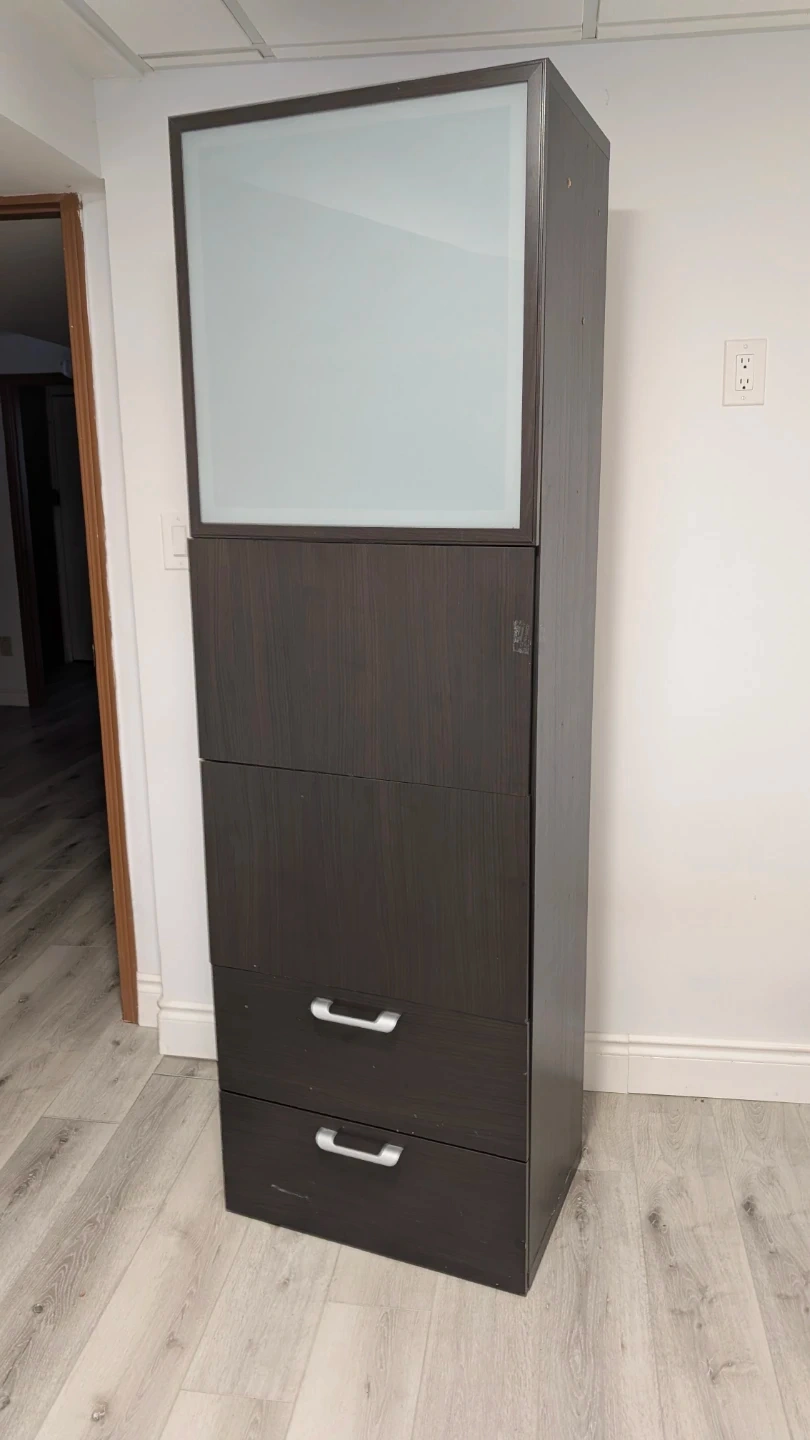 Selling a tall brown cabinet with a combination of shelves and drawers. It's great for extra storage and keeping things organized. Perfect for any room in the house