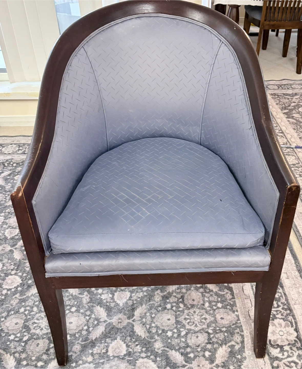 Here's a lovely blue upholstered accent chair! The chair has a wooden frame and a patterned blue fabric. It would be a great addition to any room.