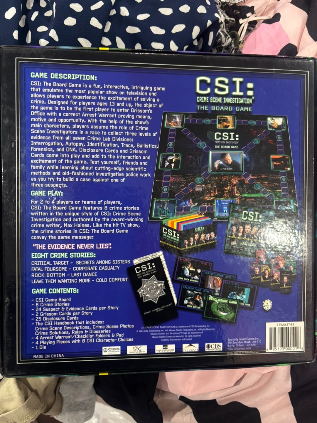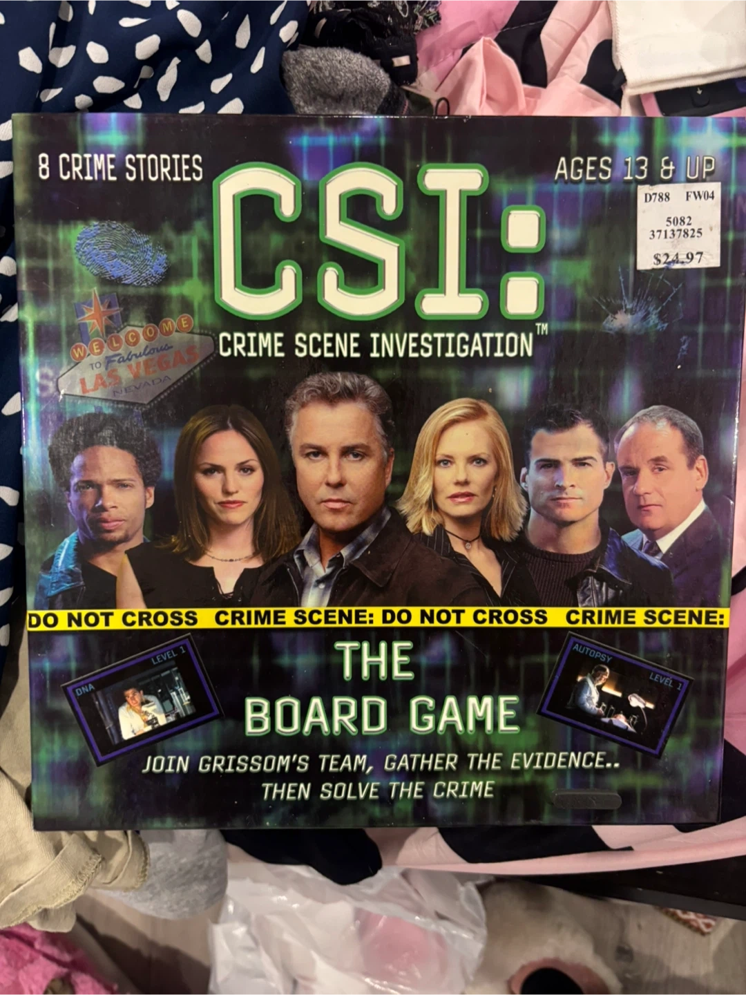 CSI: Crime Scene Investigation Board Game for ages 13 and up! Join Grissom's team, gather the evidence, and solve the crime. Includes Crime Scene Board, Crime Scene Cards, and more!